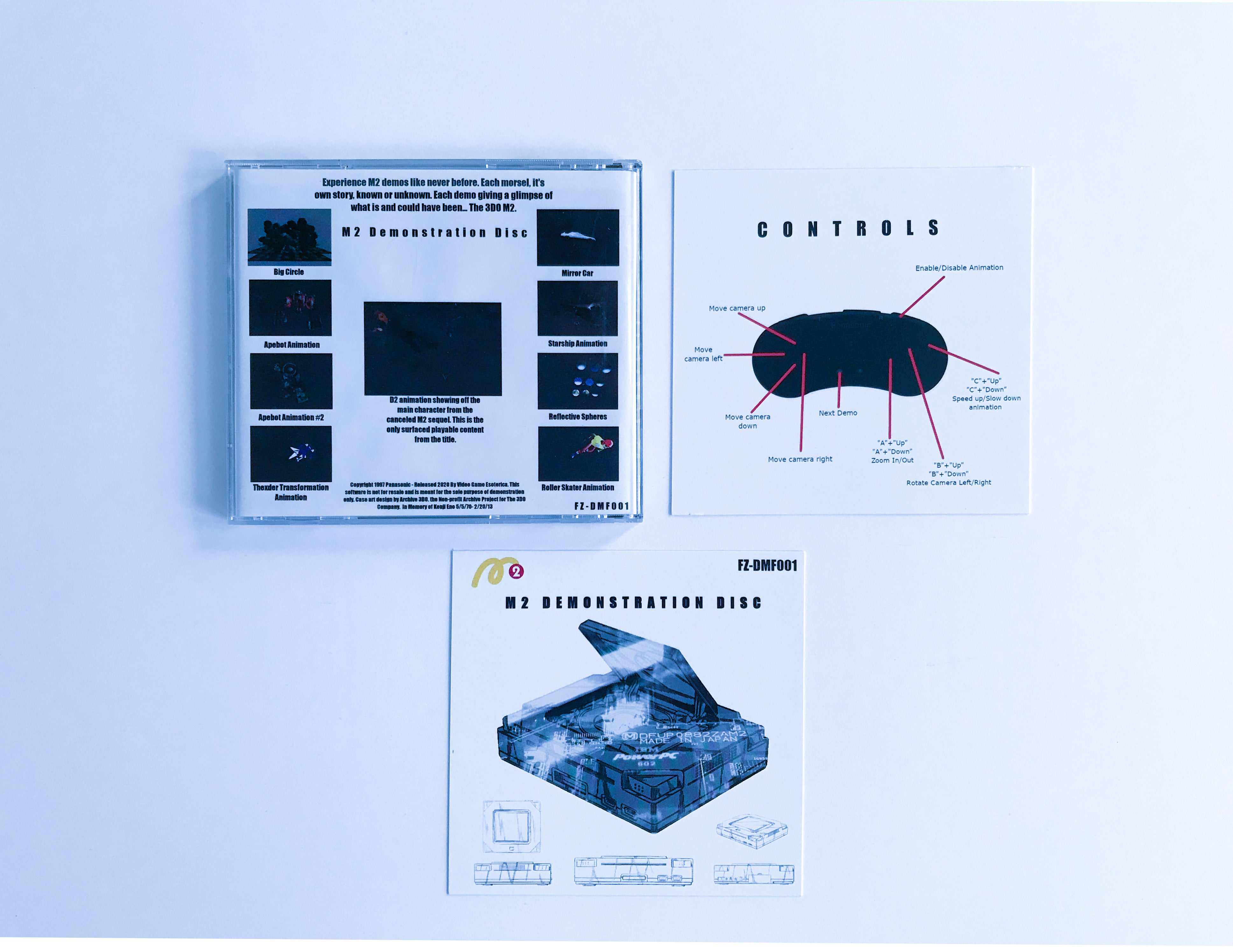 The free demo compilation is the largest dump of M2 software ever released. It contains a dozen different demos you can play and control on 3DO M2 hardware. Custom artwork for the case was created using patents Panasonic put out in the 90s, there's a slip for controls and, on the back, screenshots showing the various demos included on the disc.