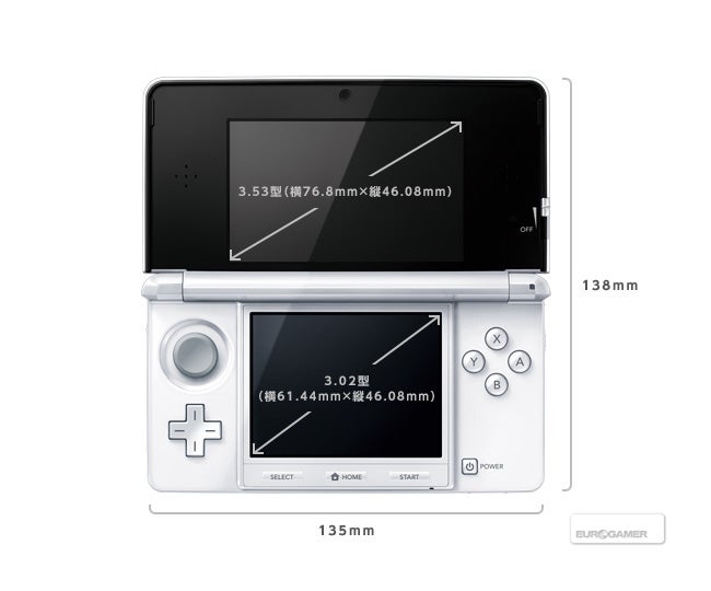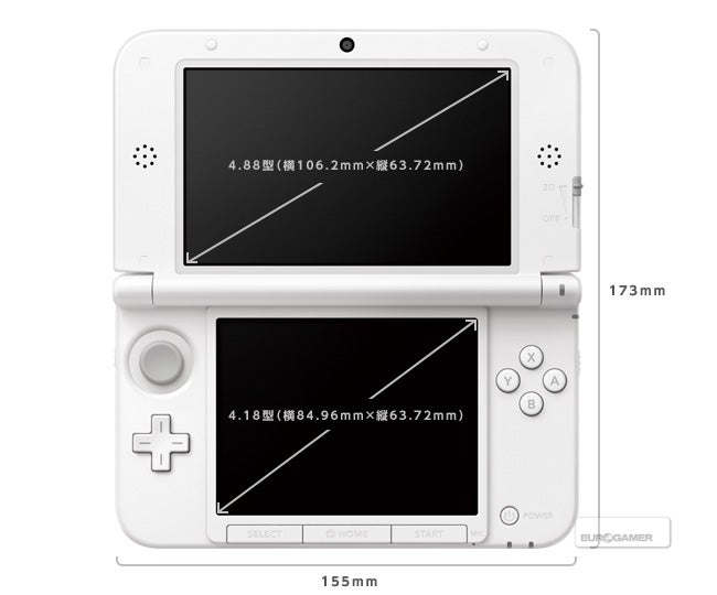 - Screens: top 4.88 inches diagonally, bottom 4.18 inches diagonally (3DS top 3.53 inches diagonally, bottom 3.02 inches diagonally)