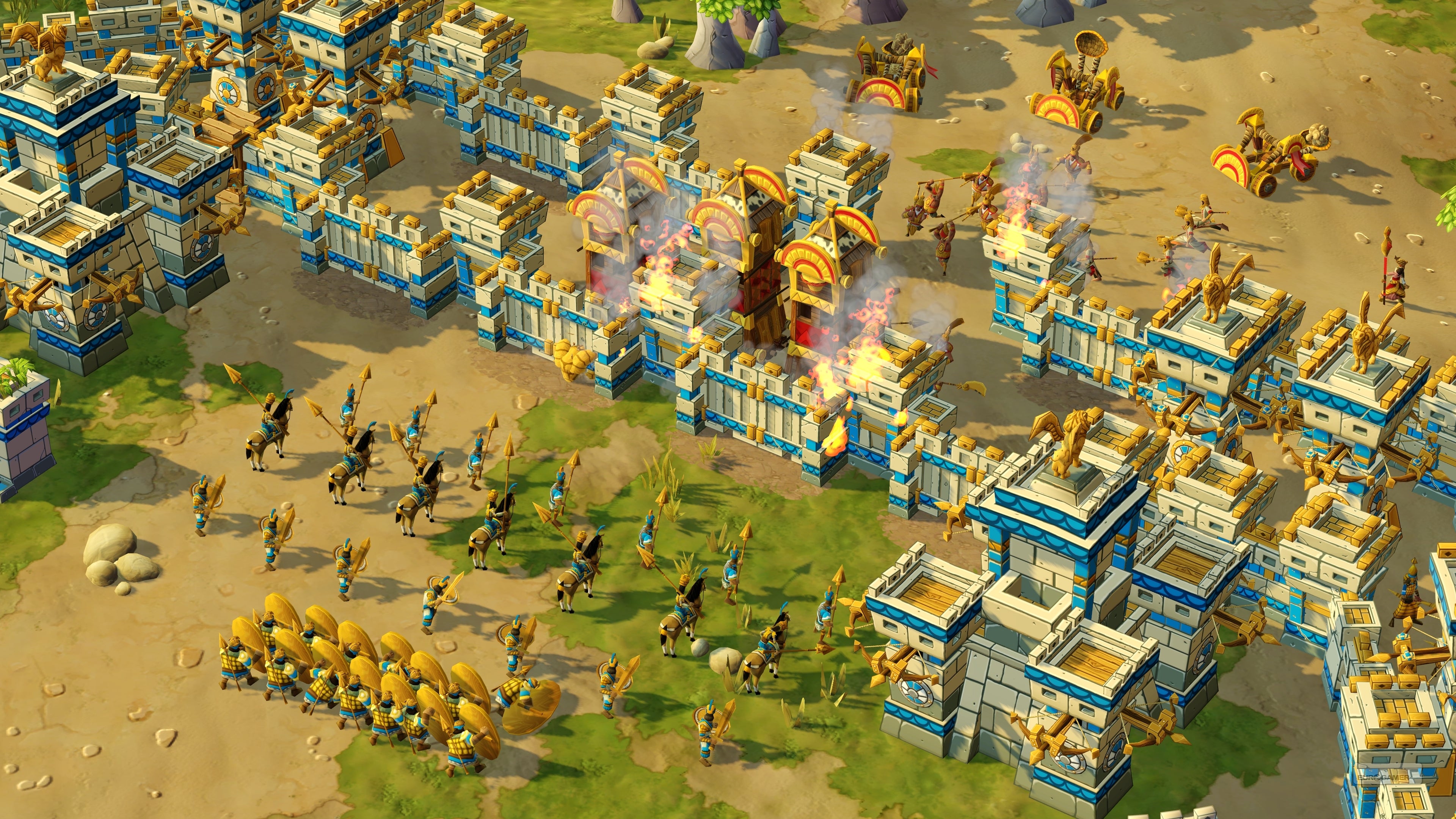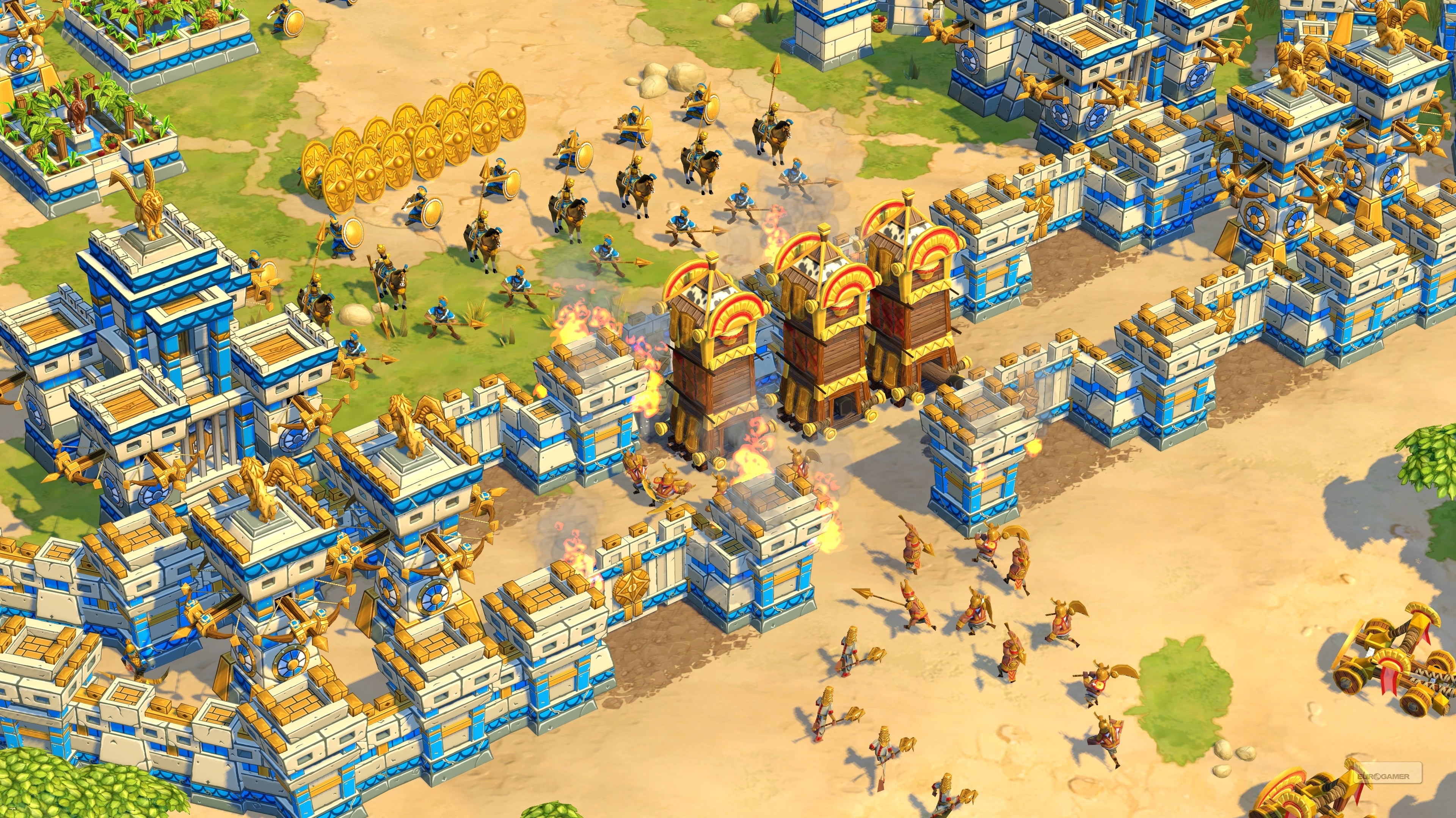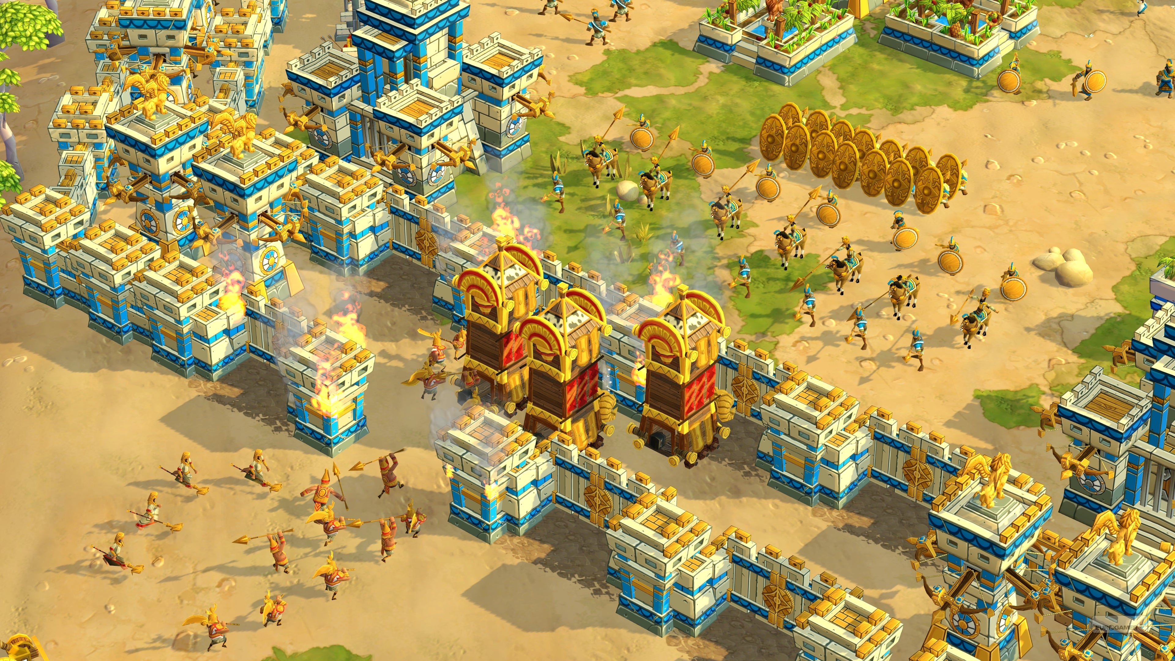 Among the Babylonian's most interesting new additions is The Siege Tower, which acts as a Trojan horse of sorts. It can transport several units and comes with its own ranged fire-arrow attack, while opponents can't see what units are inside. Maybe it's a formidable battalion, or maybe it's a decoy. "You have the ability to mask what you're doing by hiding your army inside the siege tower, and we've seen a lot of cool strategy come out of that," said systems design lead Eric Williamson.