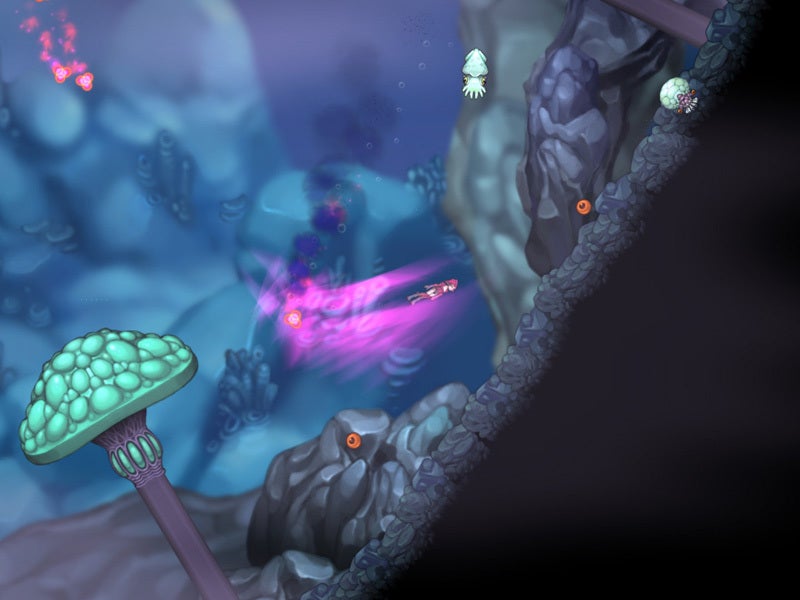 The shooter influence is in enemy design and your own combat techniques. Able to move freely around the huge underwater world, probing the walls and ceiling as well as the ground, attack and defence are more than a matter of jumping out of the way; you need to be deft with the mouse and mindful of the enemy's size and strength. Enemies are seldom overwhelming - only the bosses are really worrying - but going somewhere in a rush or navigating carelessly can put you in peril as tiny but spiky aquatic grumps and bottom-feeders pile into your path.