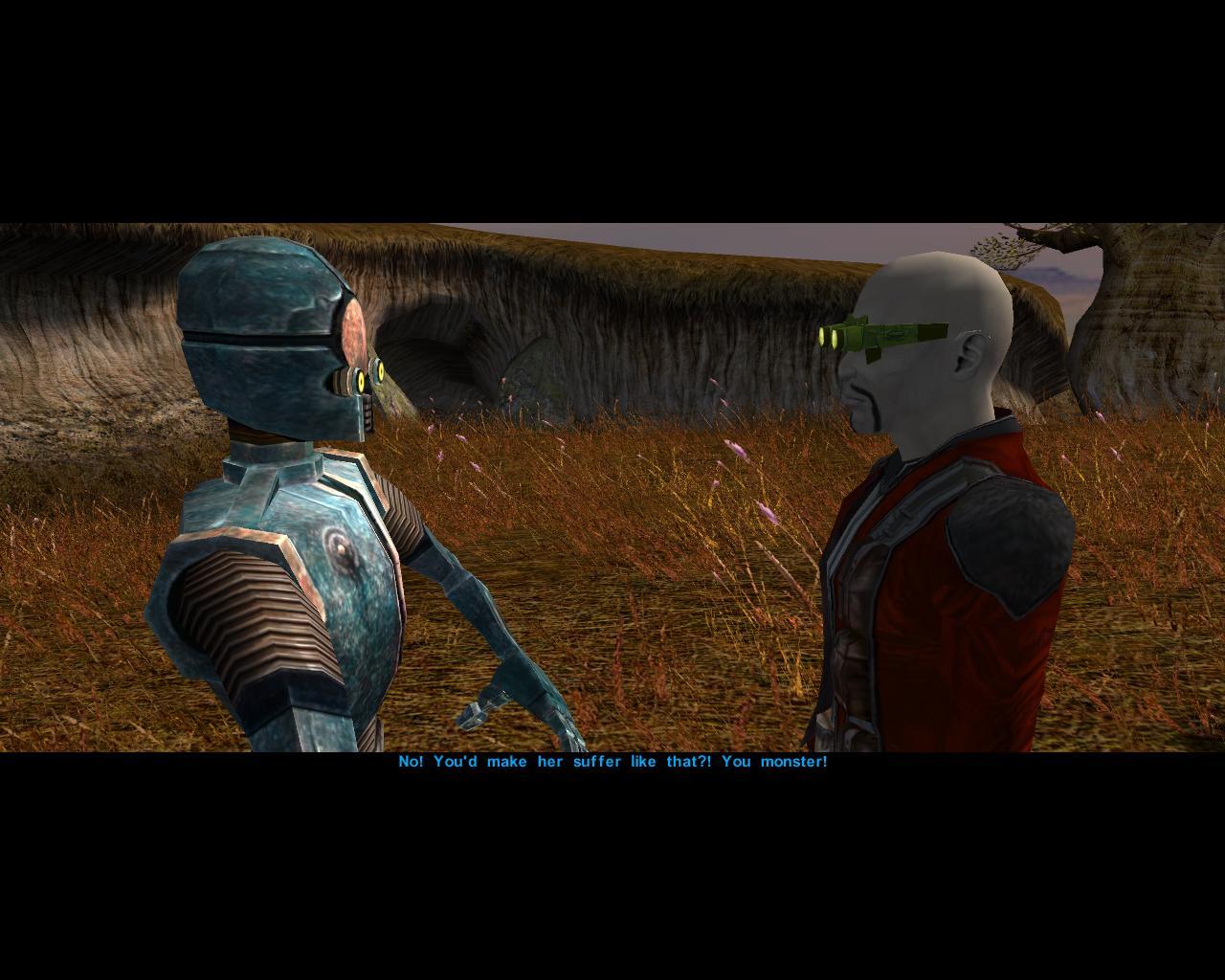 There's a weird flaw in KOTOR that's highlighted when you play this way. The two members of your party you've chosen to bring with you will splurt and bluster their disgust at your behaviour, but when it comes to the battle itself, they join in with gusto. The simpering idiot Rebel soldier, Carth Onasi, will throw his moral weight around until the game enters combat mode, and then his regular battle barks appear. "You asked for this!" he shouts at the weak, miserable Jedi who's only desperate for help. I put this down to my corrupting influence. There are two far more awful things I did on Dantooine, however, far beyond murdering Juhani and then successfully lying to the Council about it. First was the woman with the droid.
