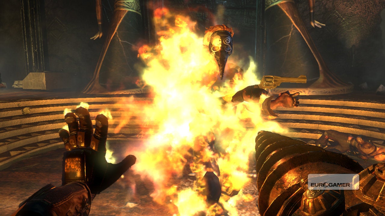 Once again you are equipped with plasmids and standard weapons, but now you can use both at once, loosing genetic powers with one hand and regular projectiles with the other. You can cycle between alternatives in each category, or pause the action momentarily to change your loadout through quick-to-use radial menus. As a Big Daddy you have access to new weapons, too, including a drill, a magnificent spear gun that pins enemies to walls by their appendages, and a grenade launcher the size of a filing cabinet.