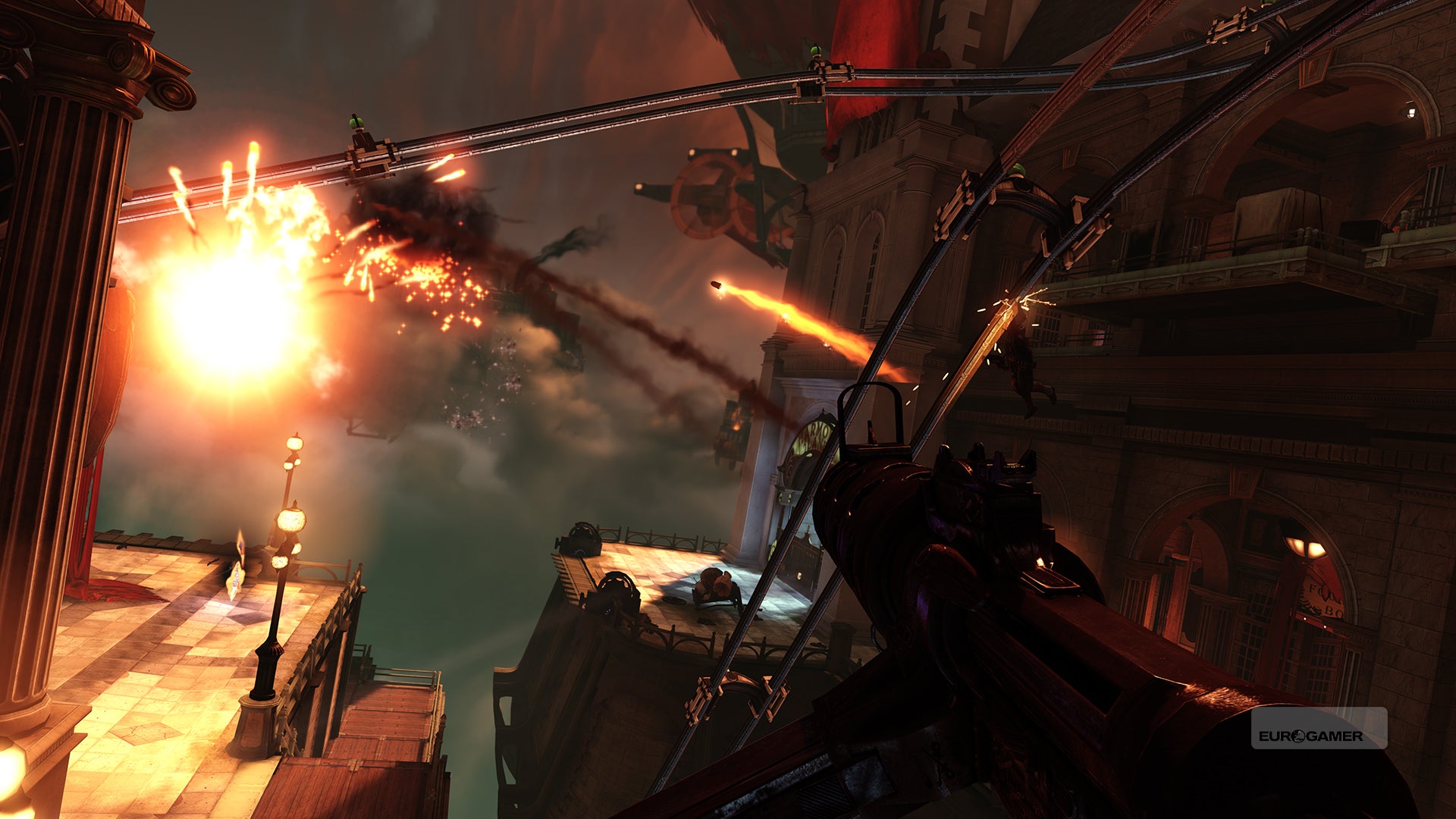 That mobility is important, too, because whereas BioShock was a close-range shooter set in tight environments, Infinite's broader horizons make for roomier fights. It wasn't long before the sniper rifle became ever-present in one of my two weapon slots, but I still needed to have something useful at close quarters, because most of the well-designed battlegrounds are also home to skylines - overhead railways of metal that you leap and latch magnetically onto at the touch of a button, soaring through the environment to escape or run down foes who are also equipped with hook devices.