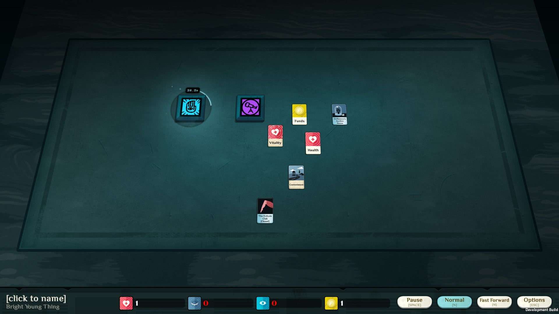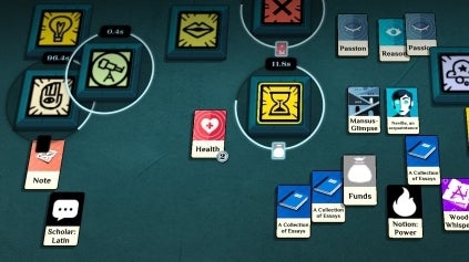 Cultist Simulator is about forbidden knowledge, forgotten histories and ill-advised pacts with entities who aren't so much gods as unsettling cosmic frequencies, felt rather than understood, but it would be nothing without its monotony. Starting the game, you are confronted not with a squiggle of eldritch geometry but a wooden table covered by a worn leather mat, its scratches picked out by a strange cobalt light. An hourglass timer begins to drain away, sucking Fund cards out of your hand with every revolution; you counter by plugging Reason, Passion or Health cards into a Work timer to generate more. This mundane rhythm keeps up throughout the ensuing 20 or 30 hours, as cards and timers of all kinds slowly cover the tabletop, each accompanied by a gravid yet delicate prose snippet about the game's curious, alternate-1920s England. It's the bassline for an experience that is as much an investigation of mind-killing drudgery as it is a homage to the wayward imagination - indeed, an experience that derives much of its mystery and threat from their inseparability.