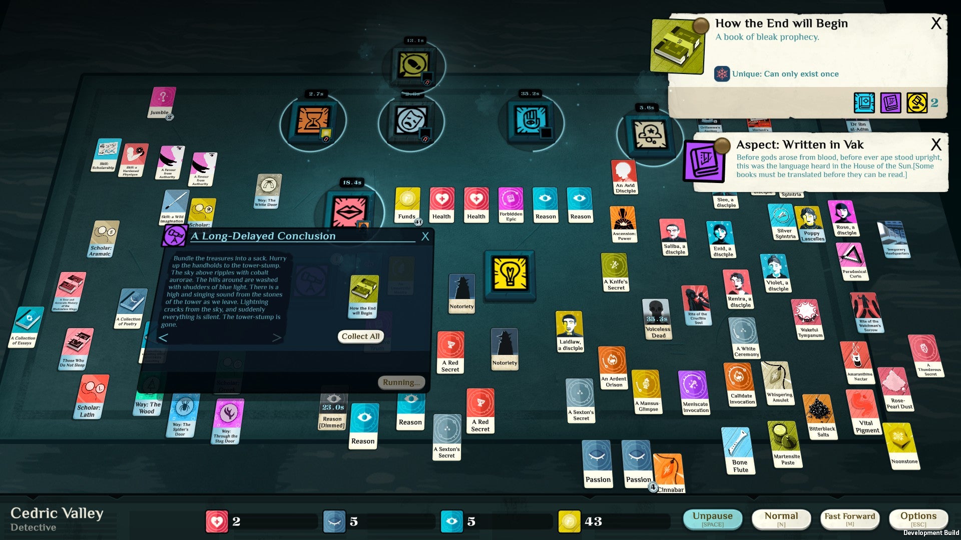 Also as in Kennedy's previous games, there is a more-than-usually-chronic sense that the writing is at war with the systems. In practical terms, the trouble with Cultist Simulator's fondness for verbal ambiguity is that it sometimes teaches you to look for connections where none are permitted. It's been intriguing to watch the game struggle with this through Early Access, as Kennedy and fellow Failbetter veteran Lottie Bevan have shaved away obscurities here and there, introducing the odd square-bracketed hint in a way that feels like a betrayal of the premise. Language at large is a volatile creature, crowded with duplicity, ripe with past usages that hang perilously over ever utterance. Cultist Simulator does a wonderful job of revelling in this, but it is also a card game made up of piecemeal, linear connections, subject to the basic economic principle of adding things together to create other things of greater value. At its least marvelous, the game is almost a prison for its own wit, a factory where vivid, open-ended fantasies are melted down into bitty commodities. This is especially apparent when you start over, of course, as hitherto exciting card combinations grow routine - and you will do a lot of starting over in Cultist Simulator, though there's a choice of opening backstories and vocations to ease the pain.