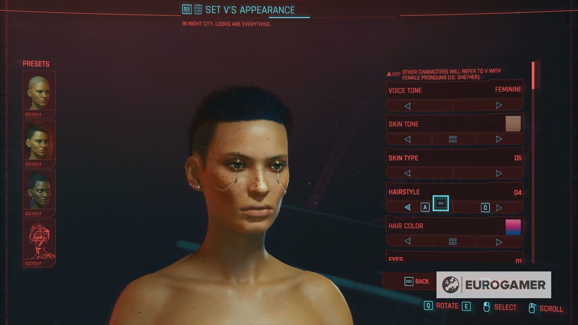 You also begin with a deep, if somewhat overcompensating character creator. The customisation is equal parts fantastic and ridiculous, and a good look at CD Projekt's conflicted approach in microcosm. There are wonderful, microscopic details to hair and fingernails and scarring - and also half a dozen penis options, choices for breast size and the diameter of your areola. There are just the two genders, mind, and, in the game's words, the pronouns people will use for you in-game are dictated by your voice - an oddly prudish and self-defeating decision, that's clumsy at best and sits at odds with the world itself, making for one where everyone can modify their limbs and eyeballs and sub-dermalogica membrane at will, but god forbid anything else.
