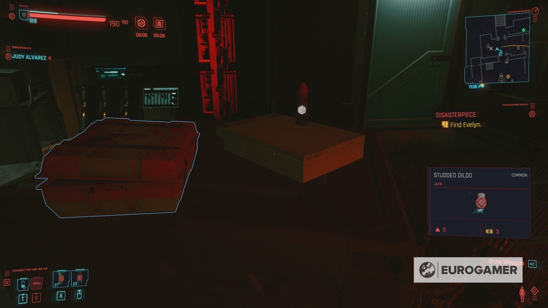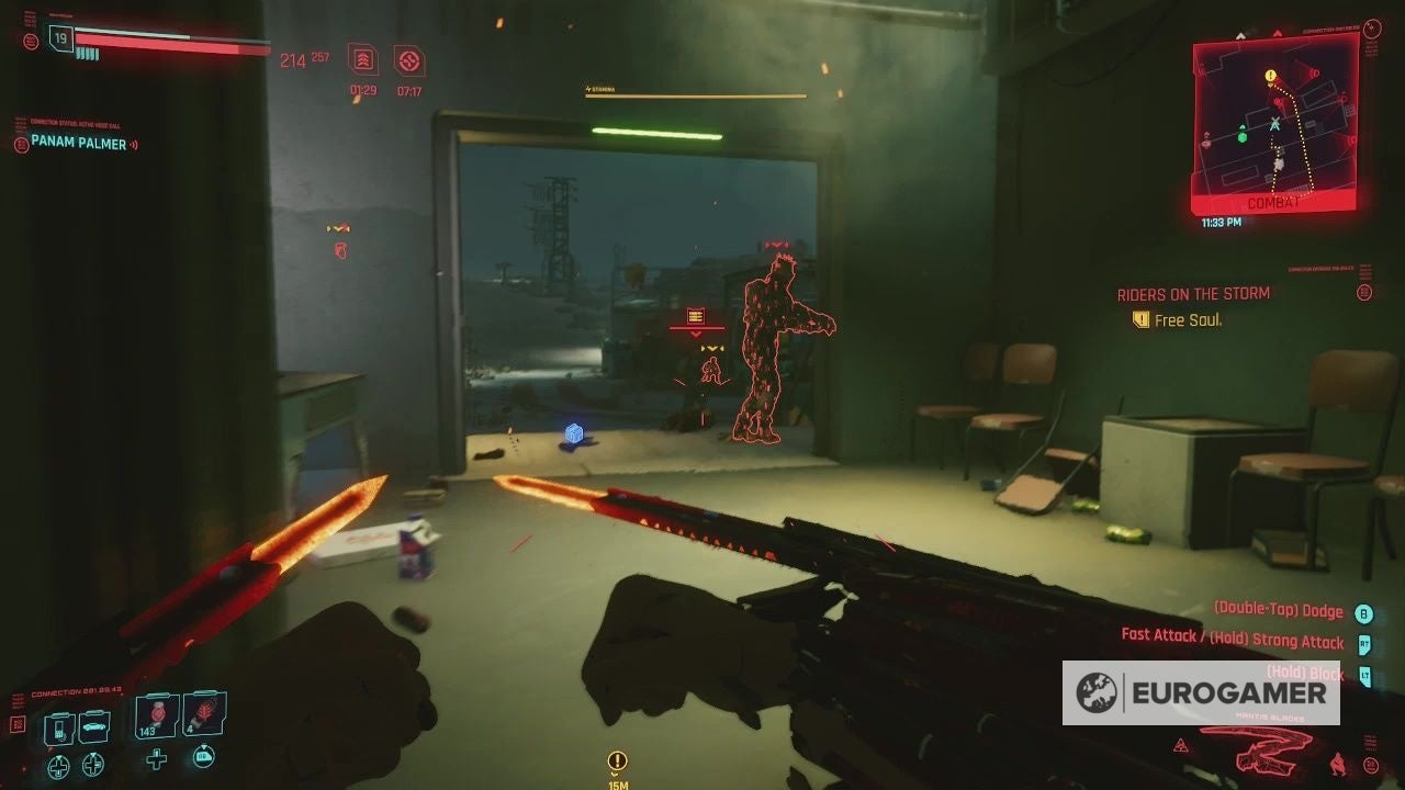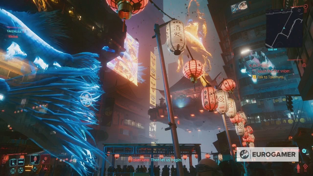 It doesn't exist in isolation though, far from it. Night City is Cyberpunk 2077's nemesis, your character's foil. It goes beyond the easy parodies, the insufferable talking heads, the insipid advertising boards. The sounds are masterfully aligned: humming neon, buzzing flies, whirring motors, screeching horns, yelling passers-by. In missions it's the same, the world tinged in perennial high-alert red, with a piercingly shrill noise that sounds every time you're even half spotted, or clip the wrong pedestrian on another chaotic ride. Cyberpunk 2077 might have GTA's five star 'wanted' system, but it doesn't work the same - you're obliterated in an instant when you get to four - and it might have denser crowds, in some places, but they're even more hateful here. The point of it is its hostility. Night City's an unlivable, unbearable place where you feel relentlessly watched and on-edge, where V, performed with superlative nuance by Cherami Leigh, can barely keep it together.