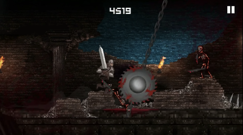 Slashy Souls puts you in the clanking armour of a knight constantly running right to avoid a smoky wall of death. Along the way you'll encounter all manner of demons that you must slash to kill, yet every strike roots you in place for an extra split-second as the fog keeps gaining on you. Your only moves are tapping the screen to slash, swiping up to jump, down to roll, and holding the screen to stand still and block - which you will never do. Outside of that, there are spells you can pick up providing shields and bursts of flame that can be activated by tapping on their icons.