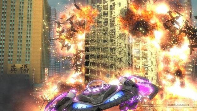 Even the Blow That Thing Up missions are no fun at all. At the end of the first area, for example, you're told to get in your flying saucer and destroy all the skyscrapers. You do this by firing your laser beam at them, which smears the buildings with weird-looking stripes of brown that are presumably meant to be scorch marks. Eventually some flames emerge, but instead of exploding the buildings they just sort of melt into the ground. Something went wrong with the soundtrack synching at this point, so the buildings I destroyed crumbled and burned in total silence.