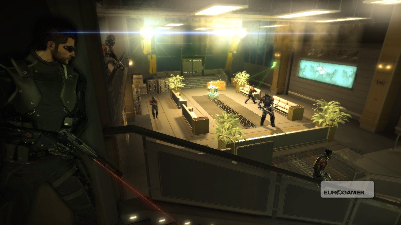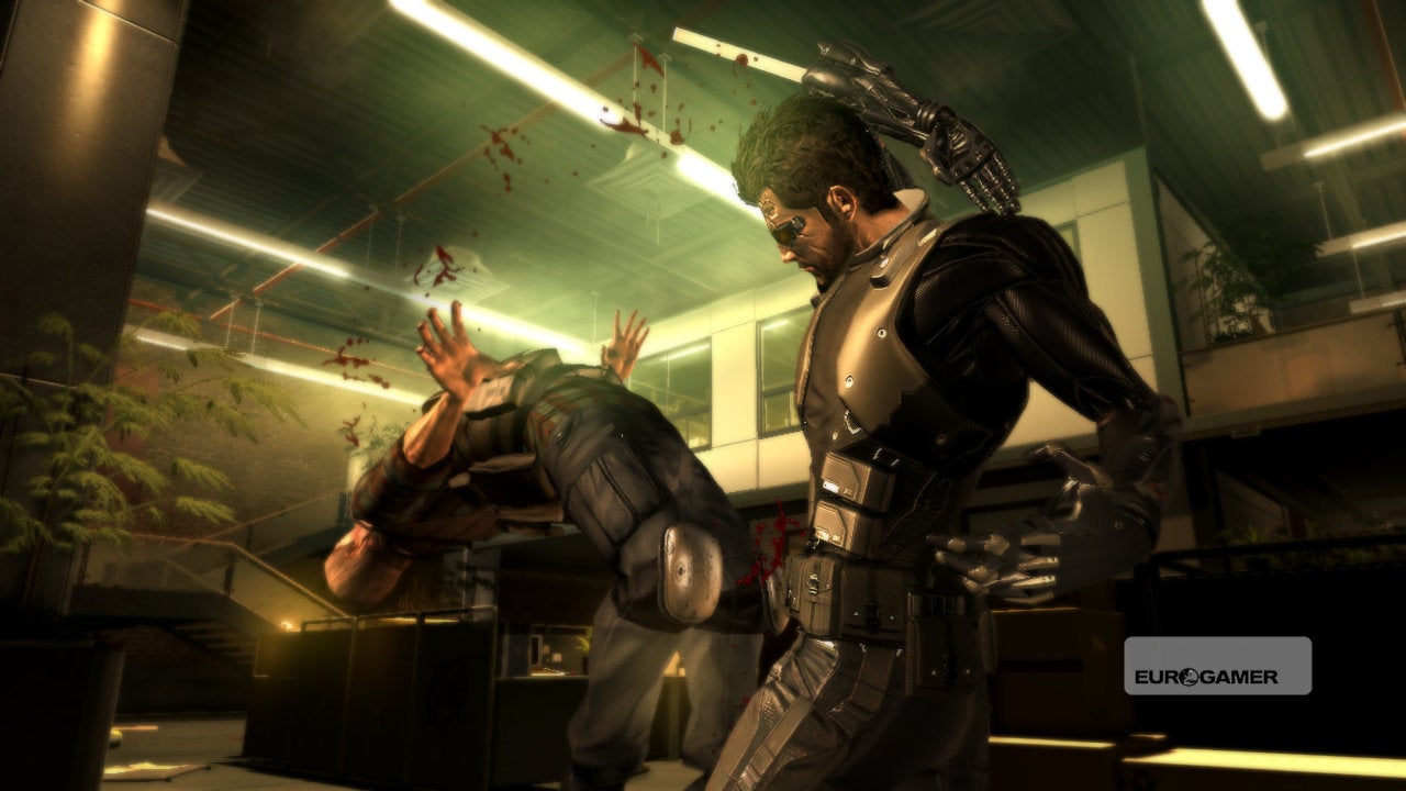 Sometimes, Deus Ex: Human Revolution is just the best Deus Ex tribute act ever. You can still save the world by crouching behind desks and hacking into people's email if you want, but it doesn't judge you if you want to do something else for a bit. In fact, it rewards you. It gives you an XP bonus for not being seen, but it also gives you an XP bonus for brutally incapacitating two guards on patrol with the same takedown.
