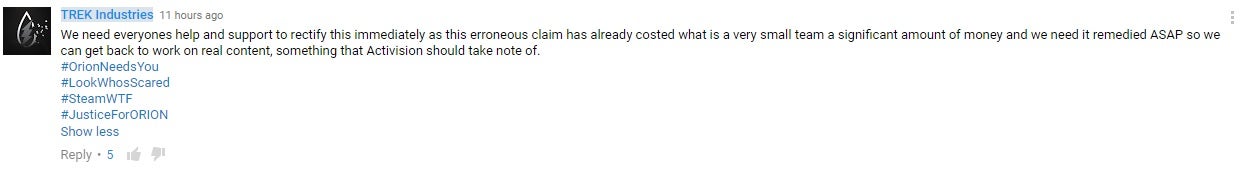 Trek Industries boss David Prassel said he received a Digital Millennium Copyright Act (DMCA) request from Activision after Orion had been removed from Steam. (At the time of publication, Orion is available to buy from Steam for 39p.)