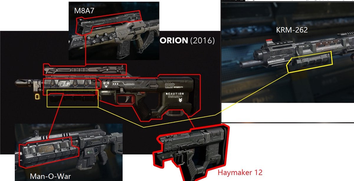 Prassel said Activision alleges Orion uses weapon art lifted from Call of Duty: Black Ops 3 and Call of Duty: Advanced Warfare, specifically the M8A7 rifle, the Haymaker rifle and the Bal-27 rifle.