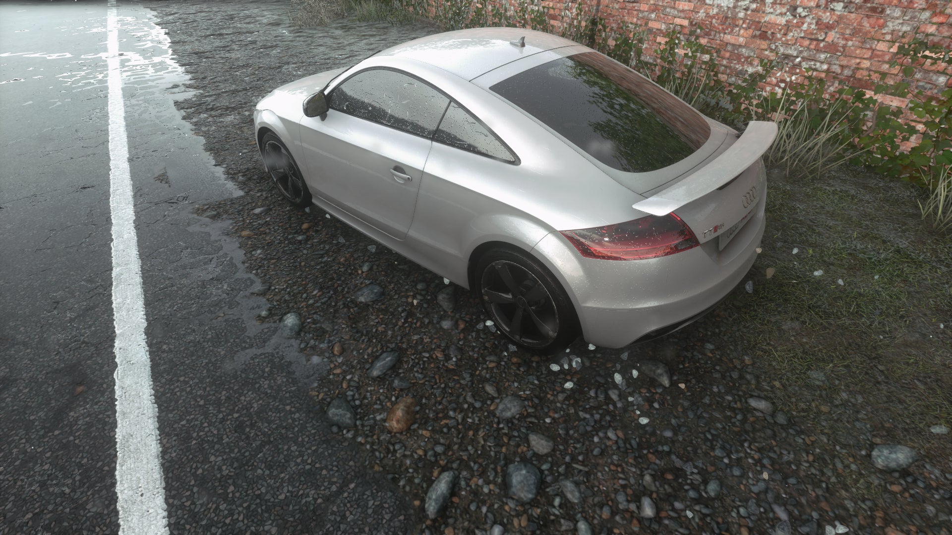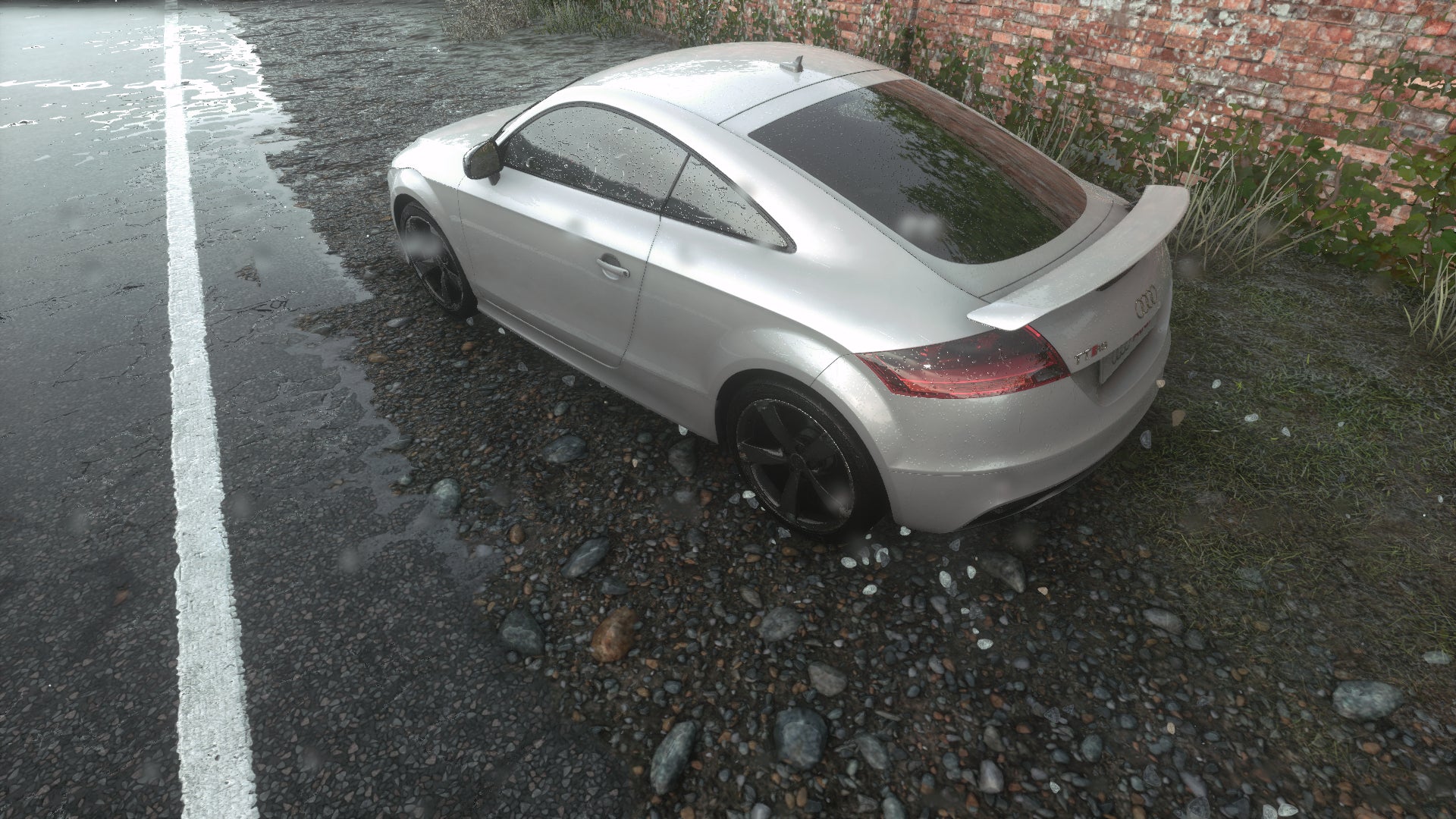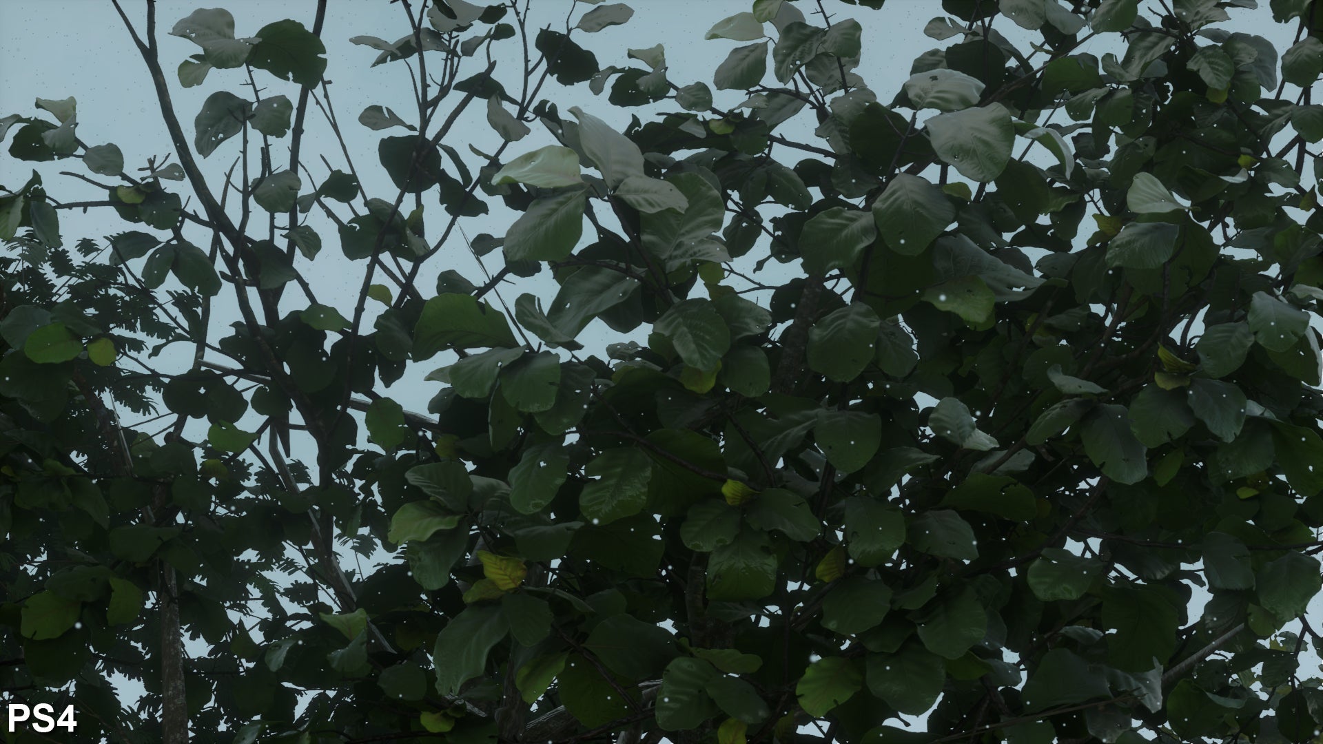 Wetness properties of other surfaces: Other elements within the game world show wetness as well. Leaves, barriers, dirt, and stone all realistically receive adjustments to their appearance to simulate the accumulation of moisture. As the game uses a physically-based rendering pipeline, this no doubt makes this process much easier to deal with. The developer is likely able to adjust both the reflectivity and gloss values independently in real-time, and the material in question should react realistically. Foliage will appear different than plastic barriers, for instance, even if the values are identical.