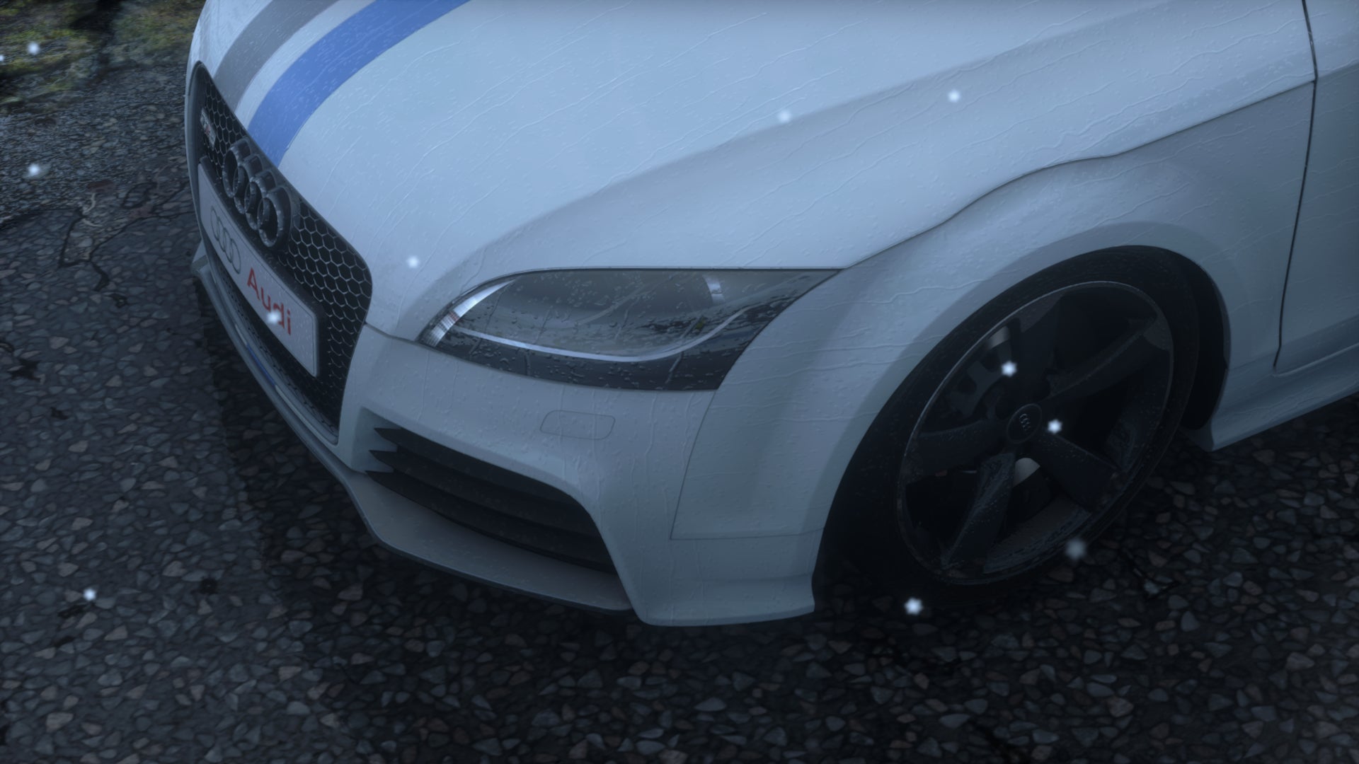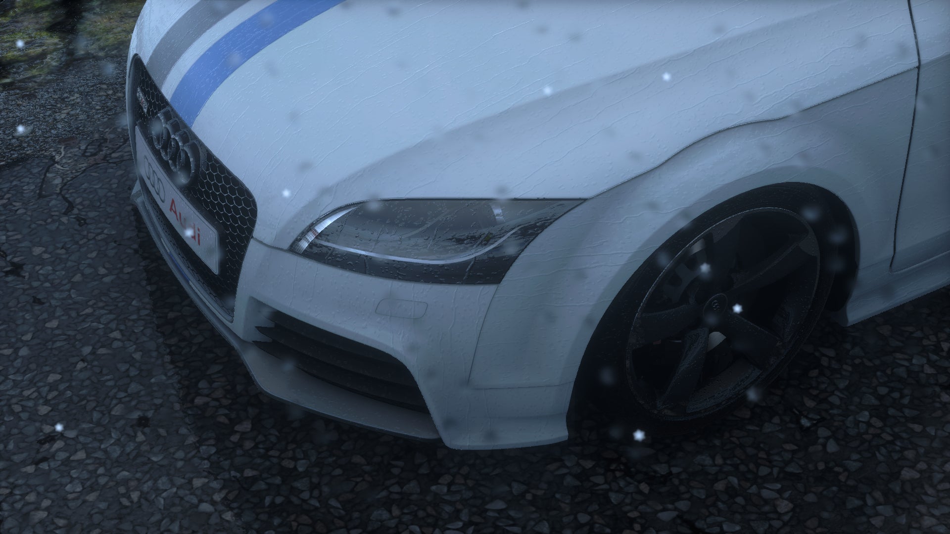 Water droplets: Unlike many games, DriveClub uses individual droplet particles to represent the rain. Each particle is impacted by the game's motion blur system, giving the impression of long, vertical streaks while driving. Evolution didn't simply draw a bunch of thin transparent lines and use them to create rain. Rather, the developer relies on the game's ultra-detailed rendering systems to handle this effect properly and correctly with unprecedented levels of interaction between cars, environments and effects. It's even crazier in the snow where blizzard-like conditions occur with so many particles on screen that it can become difficult to drive, with Norway at night proving truly frightening. More impressively, these particles are properly lit by the player car's headlamps, looking incredible in motion - with the only real drawback coming from the lack of illumination from other cars. Drawing and lighting the additional particles to make that happen would no doubt prove too costly and it's not really missed anyway, but it's worth pointing out bearing in mind the extreme attention to detail seen elsewhere.