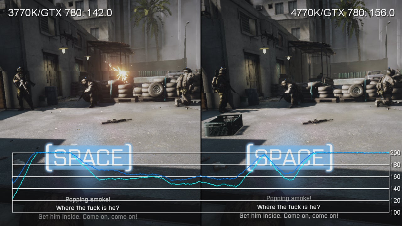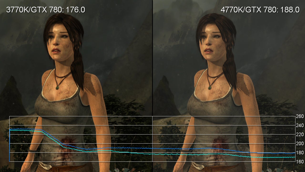 To illustrate, let's re-run a few shots from the performance gallery we featured in our Core i7 4770K review, where we compared the Haswell chip against its Ivy Bridge predecessor by running games set to ultra levels at 720p on a GeForce GTX 780, with performance-sapping anti-aliasing turned off.