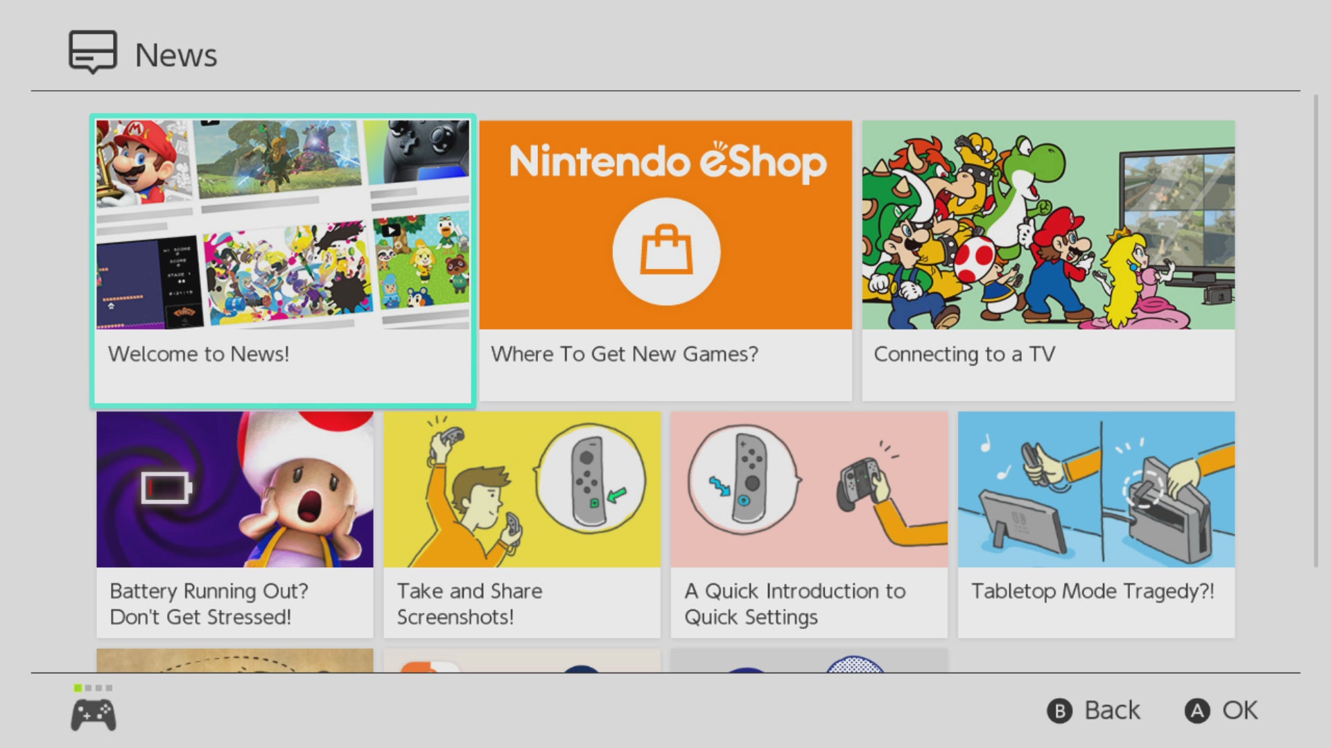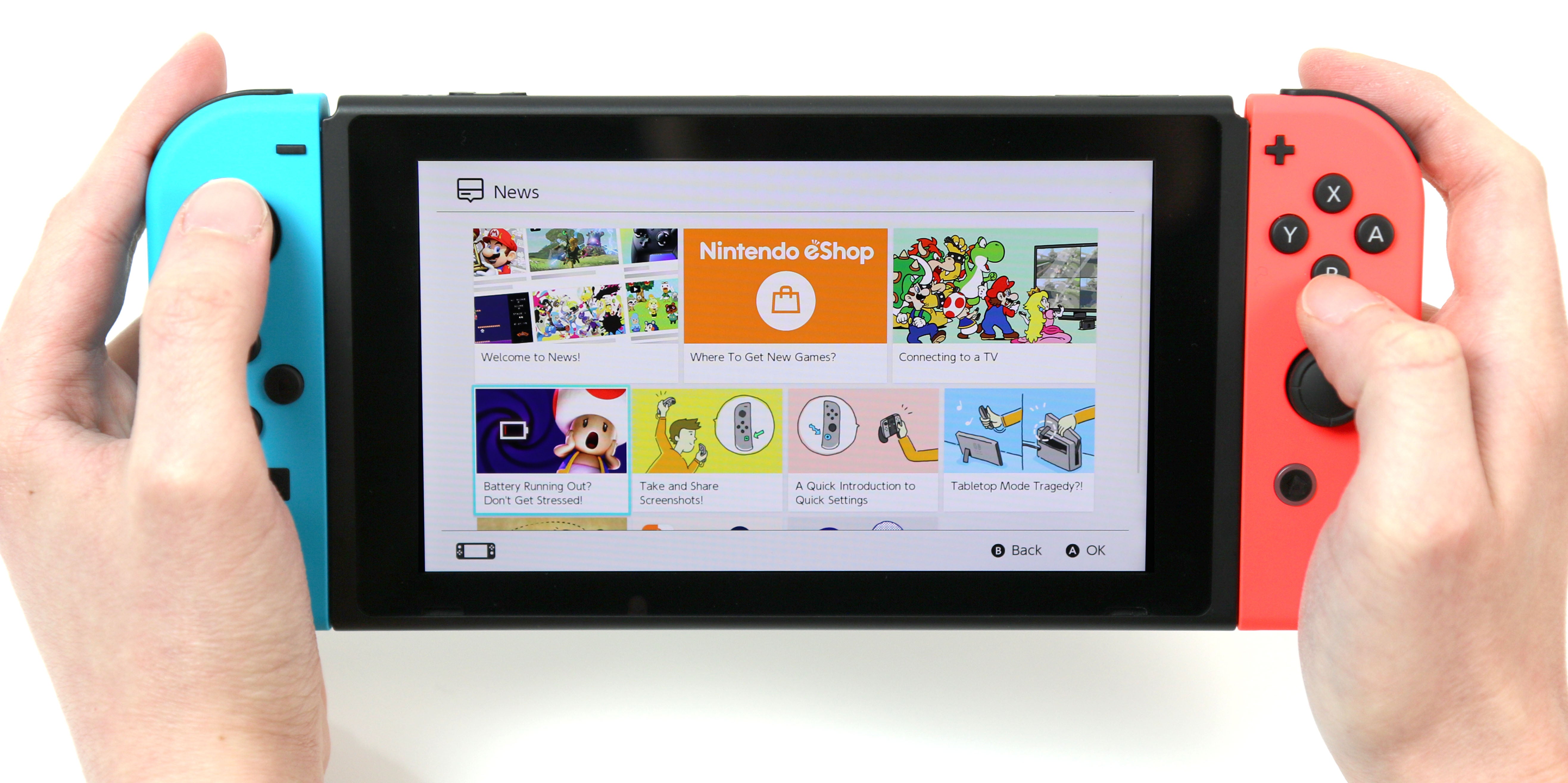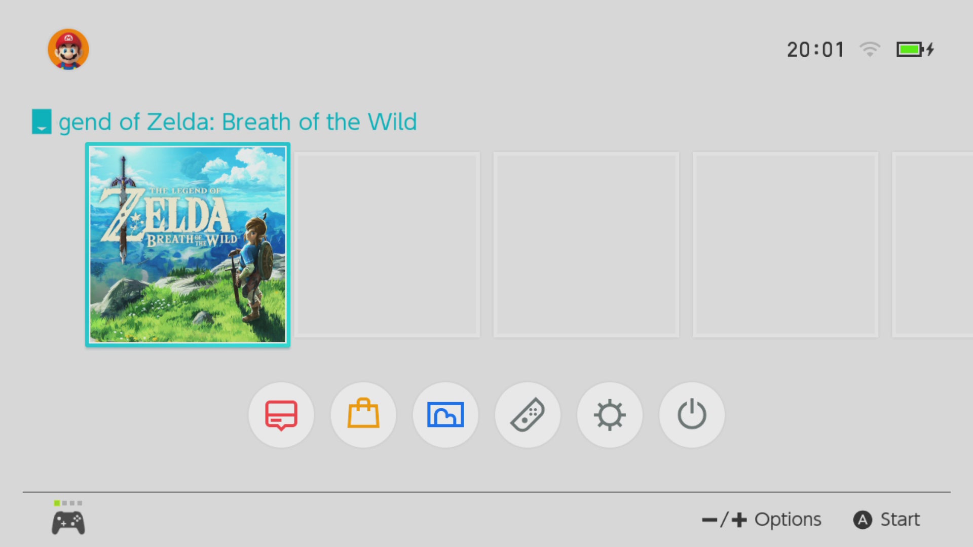 Booting the Switch to its main menu, it's clear that this is Nintendo's most straightforward system UI to date. The grid layout is gone - at least for launch - and instead you get a long row of tiles that you swipe along with your finger. It's low on clutter, with dedicated buttons for News, eShop, Album, Controller options, general settings, and power at the bottom. And it's here that you realise you can take screenshots at any time, with a tap of the square button on the left Joy-Con, which sends a JPEG straight to the album.