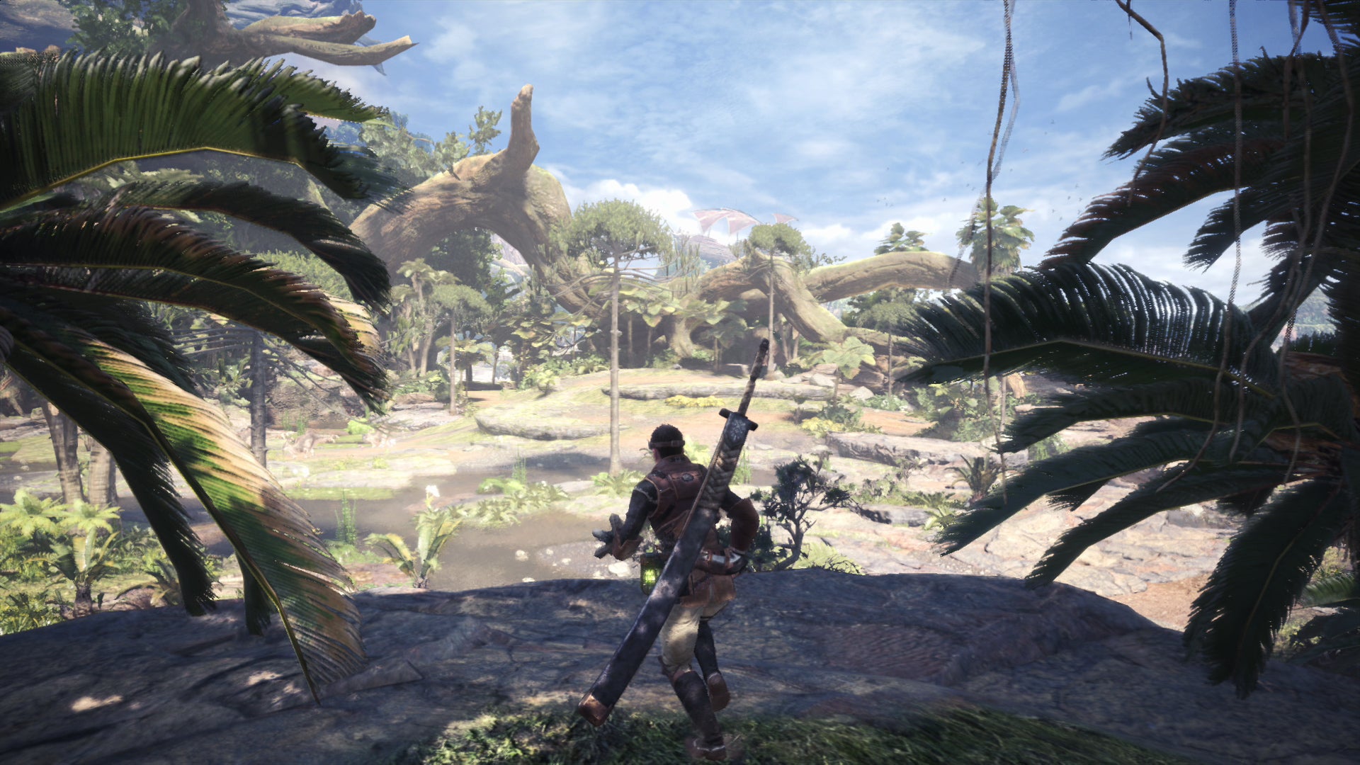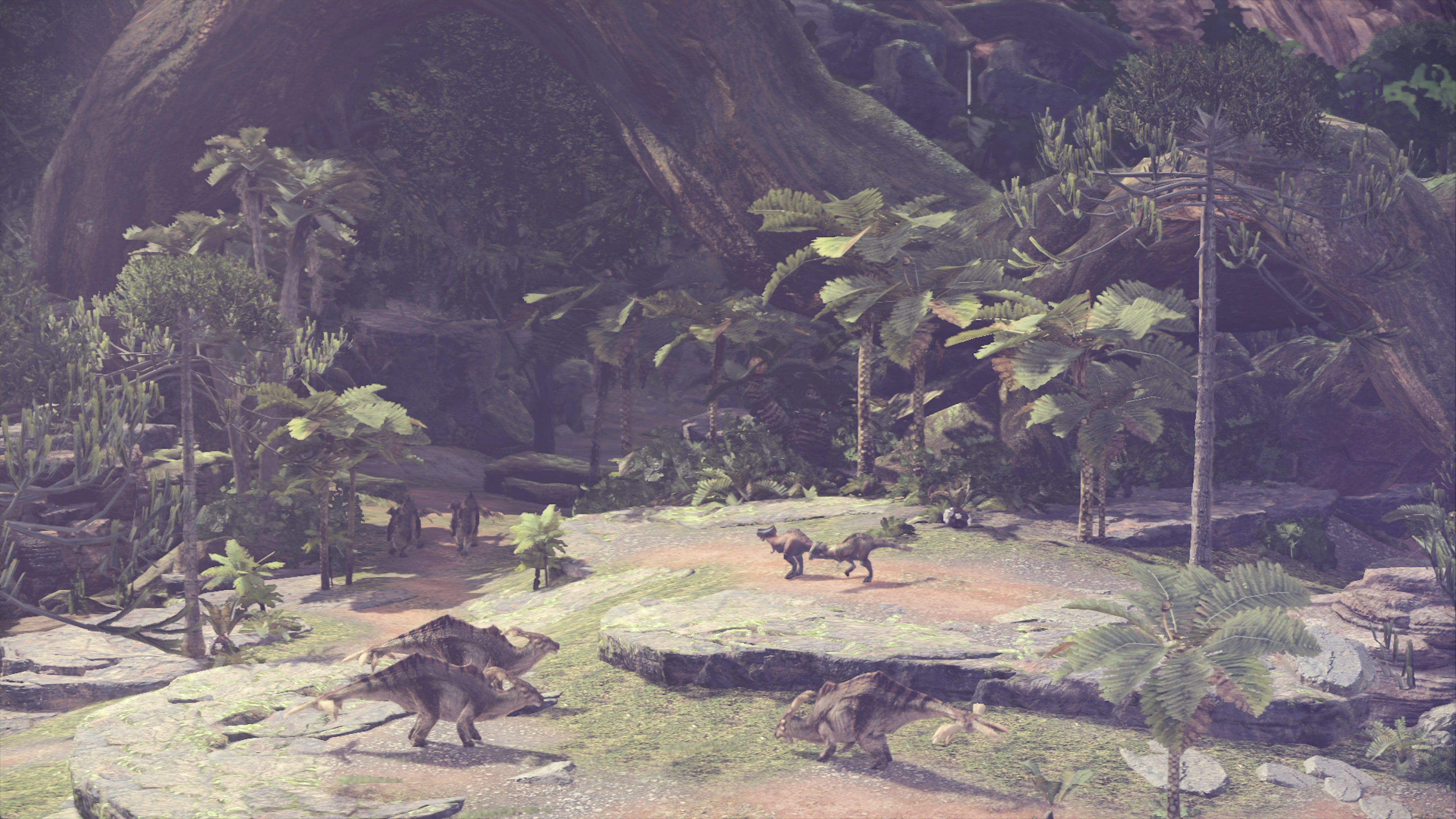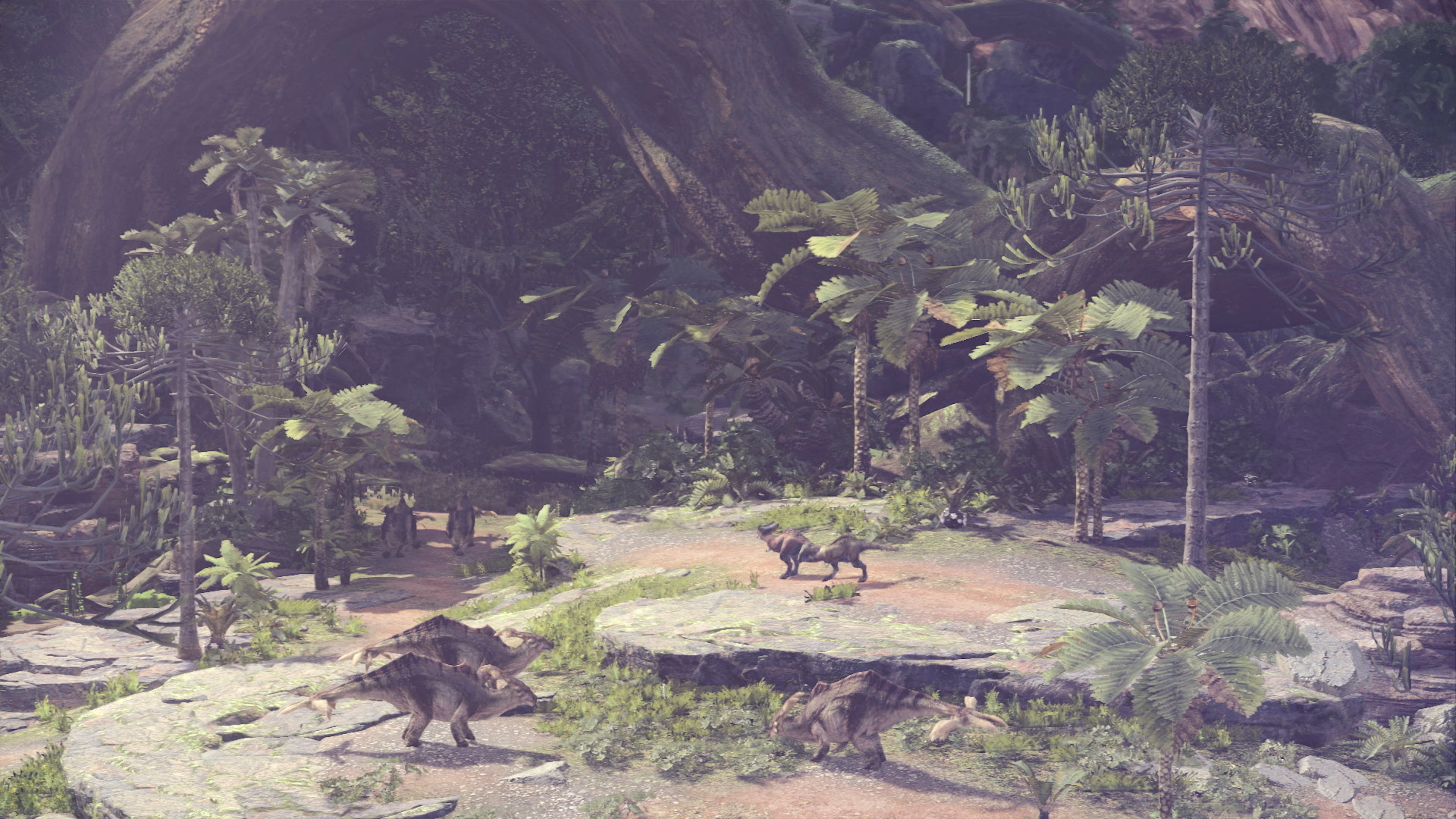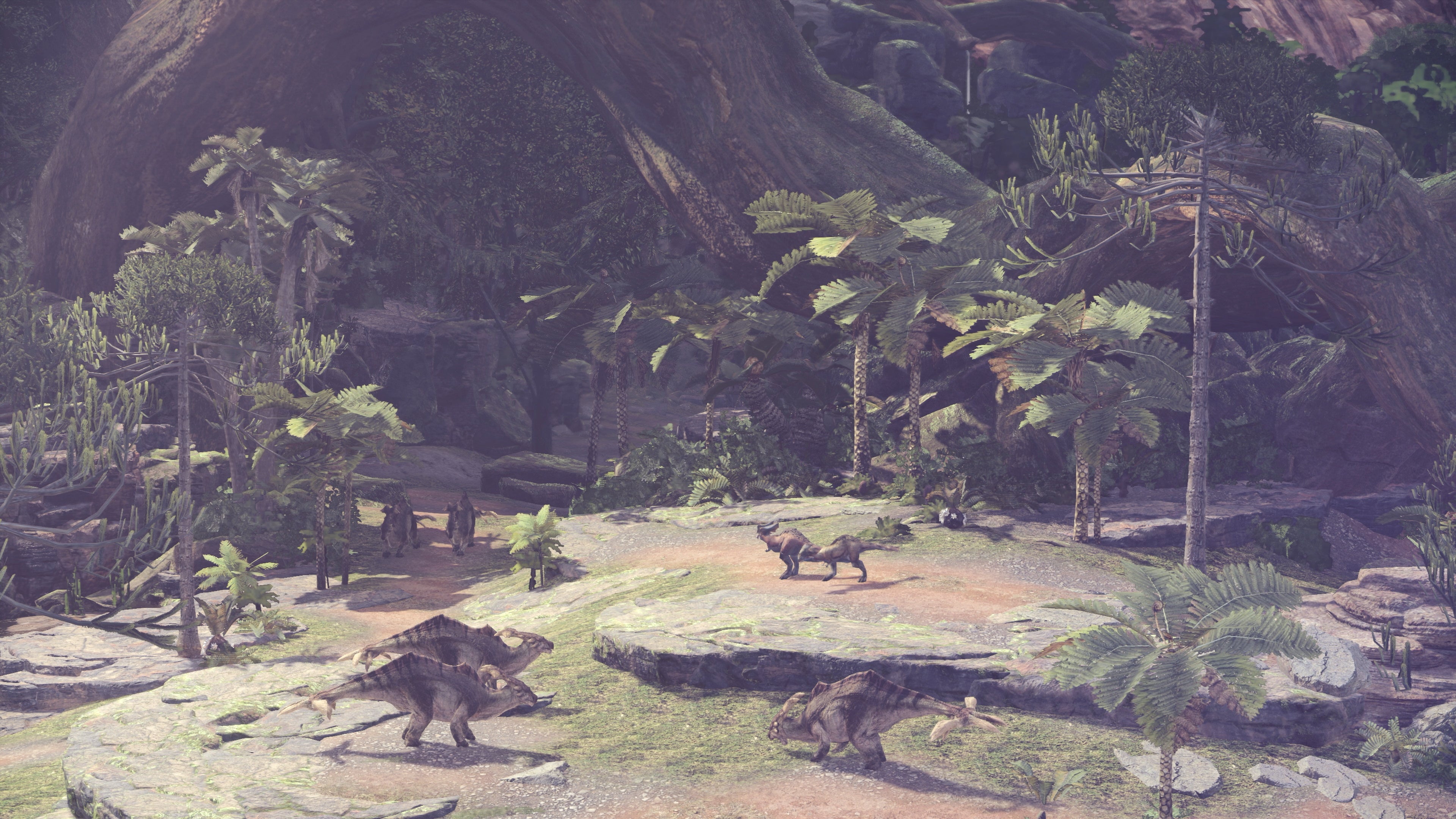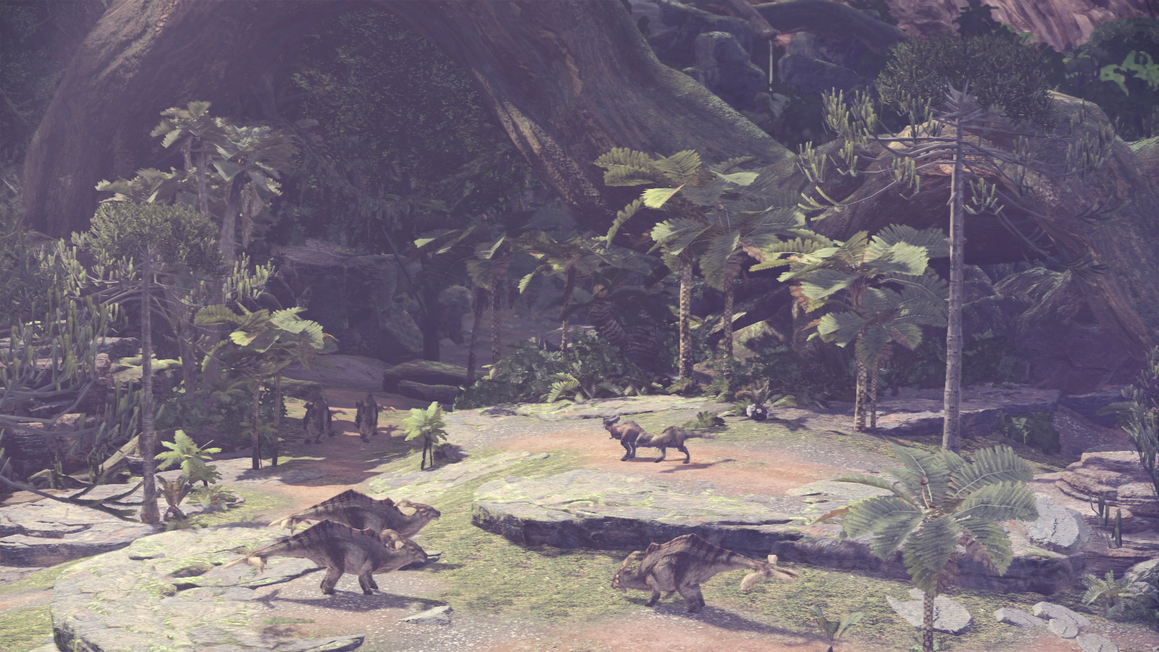 Over the course of the game, players explore a variety of unique locales with their own biomes. The first area, for instance, is rich in detailed foliage that blows in the wind and spills out over your path. Some of it is interactive, other patches of foliage have no collision, but the overall look is still excellent, while the overall sense of scale offered by the game's extensive vistas is revelatory. This is tied together in Astera - the base camp for all hunters. Recalling the designs of Monster Hunter Tri on Wii and Wii U, this area takes things further with towering structures, twisting staircases and clutter packed into every corner.