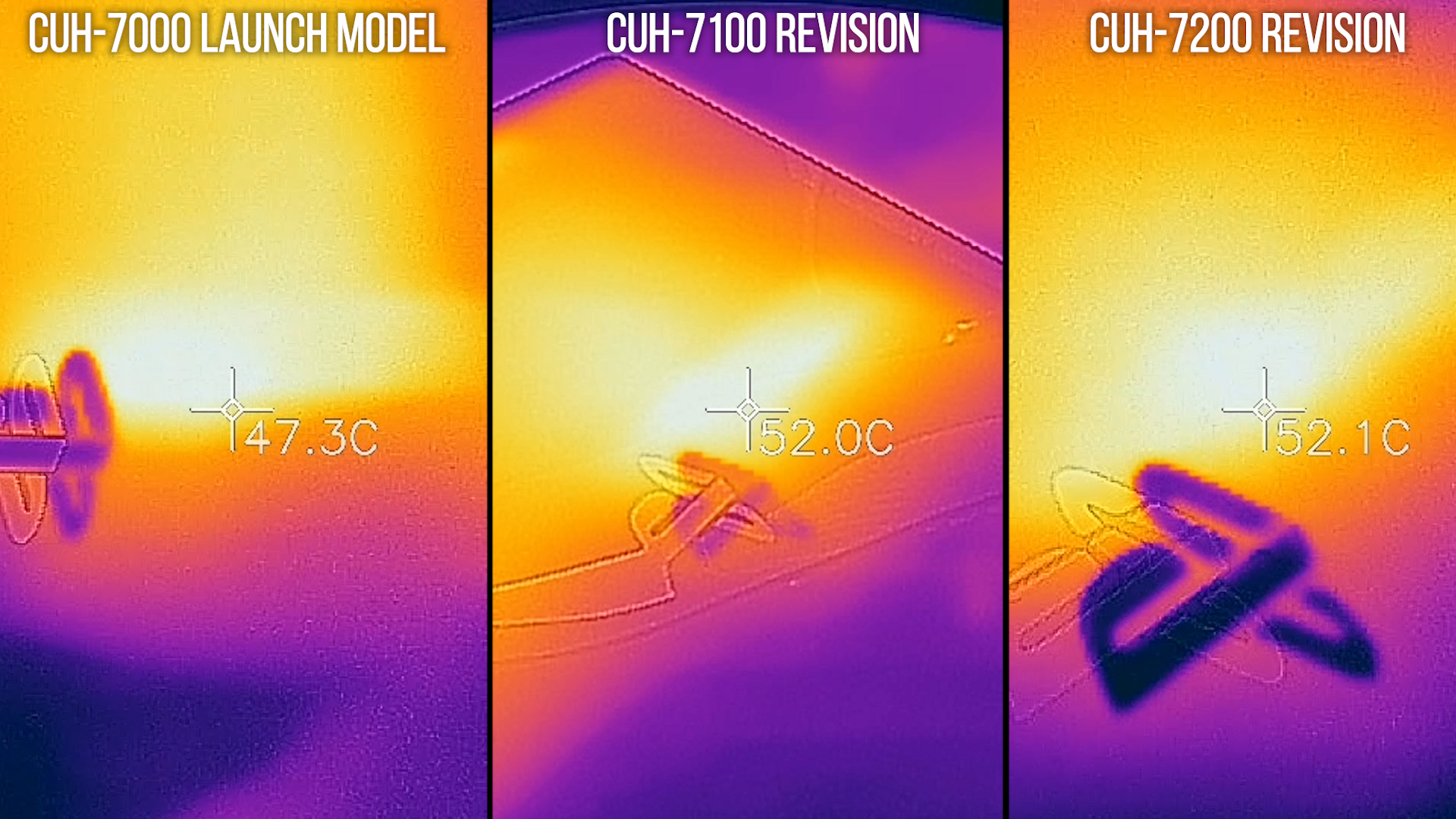 In terms of the thermals, the launch model is still the coolest. Running a thermal camera over the hottest part of skin, and then at the exhaust at the rear, the CUH-7000 has a five degrees Celsius advantage over the CUH-7100, while the new CUH-7200 runs just as hot as its direct predecessor. Whether it's down to anomalies in the thermal data or a revision in how the console exhausts heat through the rear, the back of the CUH-7200 seemed to be hotter than either of the other models. The advice here doesn't really change, however: as is the case with any current-gen (or indeed last-gen) console, make sure there's plenty of space around the machine and don't keep it in a cabinet or other confined space.