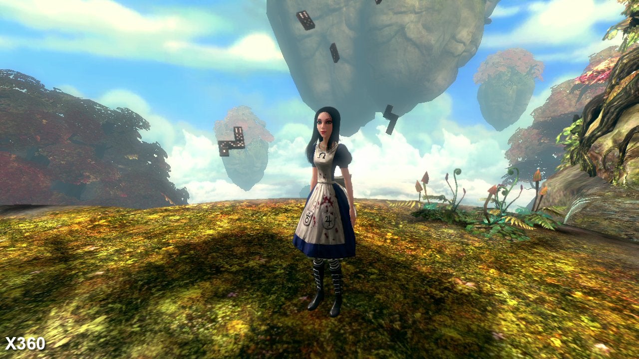 The first thing that you'll notice is that Alice is a cleaner-looking game on the PS3, with smoother edges and less in the way of subtle aliasing. The jaggies aren't exactly an issue on either version due to the style of the artwork and the colour choices employed, which tend to hide many of the edge artifacts. Both versions of the game render out in 720p and there's no anti-aliasing on the Xbox 360 version, while PS3 owners get the added benefit of a post-process-based AA solution, most likely MLAA. As there is no texture blur in Spicy Horse's implementation, edges and textures are left looking nice and sharp, thus enhancing overall image quality.