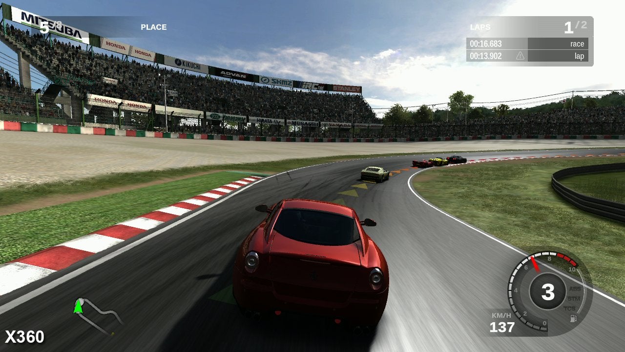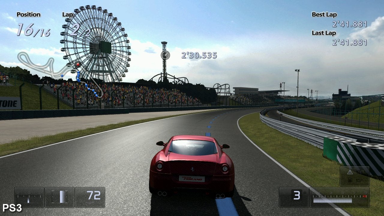 Both Forza 3 and GT5P do have elements in common: you can take your pick of cars that are shared across both games (we opted for the Ferrari 599) and the Suzuka race course is also found in both releases. So here's how this combo looks in both games. The Polyphony game has clear advantages in terms of lighting (improved in Forza 3, but still some way off the sophistication in GT5P), and also in edge-aliasing reduction. It's the only racing game on either platform that we've played that employs 4x MSAA and hits 60FPS. That's in 720p mode. Switch to 1080p, and you get a 50 per cent resolution boost up to 1280x1080 (expanded outwards to full HD using bilinear scaling) but AA drops to 2x MSAA. That's a pretty good trade-off, to put it lightly, and that additional 50 per cent resolution via the 1080p support does make a difference. On top of that, GT also manages to process twice the number of cars as Forza, but the grid runs with a rolling start in order to space out the vehicles. Polyphony doesn't skimp on its transparencies either. Hit the sand at speed, and the screen quickly fills with a very impressive dust cloud.