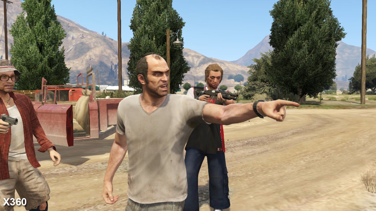 Despite each console's mandatory installs - 7.8GB for 360 via a separate disc and 8.4GB on PS3 - it quickly becomes clear that there's an asset-streaming issue on Microsoft's platform. This essentially manifests as blurrier textures in a number of spots, particularly for ground assets like concrete, grass and dirt. Whether you're at the city centre or in the wilderness, ground assets beneath Trevor, Michael or Franklin's feet are a pixel-perfect match for the PS3 version equivalent, but the quality dips off noticeably a metre ahead in the player's field of view on 360.