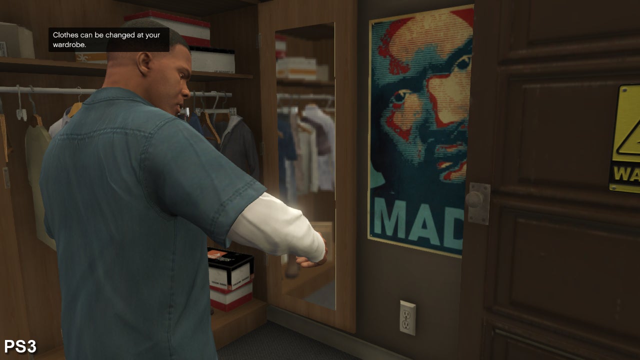 Running straight from disc, then, there's little to distinguish the PS3 and 360 releases when it comes to object detail, but there are some curious catches. Flying the Cuban 800 plane around shows up variations in grass placement, but more striking is the presentation of palm trees regularly sighted around the city. Their more flourishing look on 360 is unusual given the parity elsewhere, though we notice the upshot of this is a nasty pixel-crawl across their tops during slow pans, suggesting alpha-to-coverage dithering in concert with the post-AA producing the unwanted effect [Updated: corrected]. Also falling within nitpick territory is a slight difference to reflection map resolution while in front of Franklin's bedroom mirror - the PS3 delivering a lower-quality, pixellated alternative to the 360's reflections.