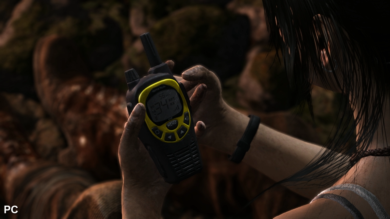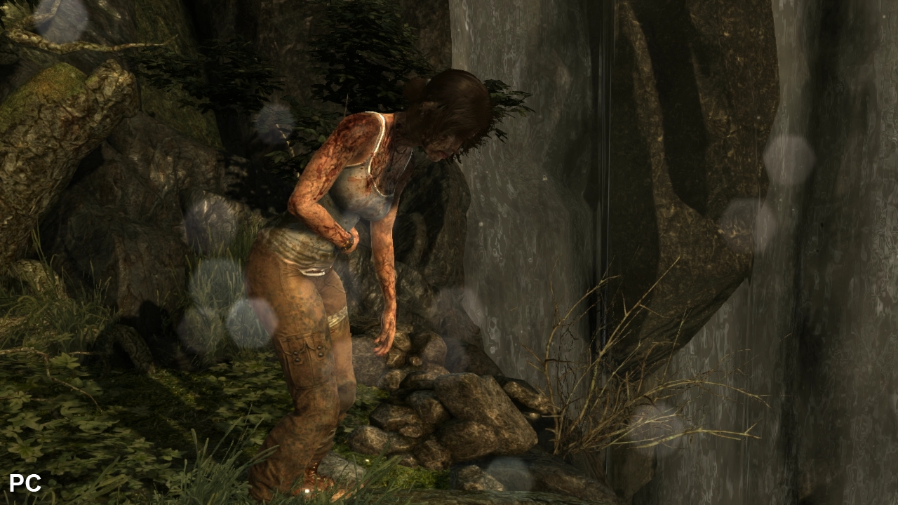 Lara's environment is rendered in higher quality on the PC, where the use of higher resolution textures and normal maps on some surfaces are joined by better anisotropic filtering, adding yet more detail to the lush organic landscapes on offer. Tessellation, which provides various objects with a large geometry boost when moving closer to the camera, is used extensively throughout the game on many surfaces to give these a smoother, more refined look. The effect is also used on Lara herself, especially noticeable in carefully rounding off her fingers during cut-scenes as she grips various objects. These features appear more lifelike and convincing when combined with how Lara herself interacts with the environment, helping to better immerse the player in the experience.