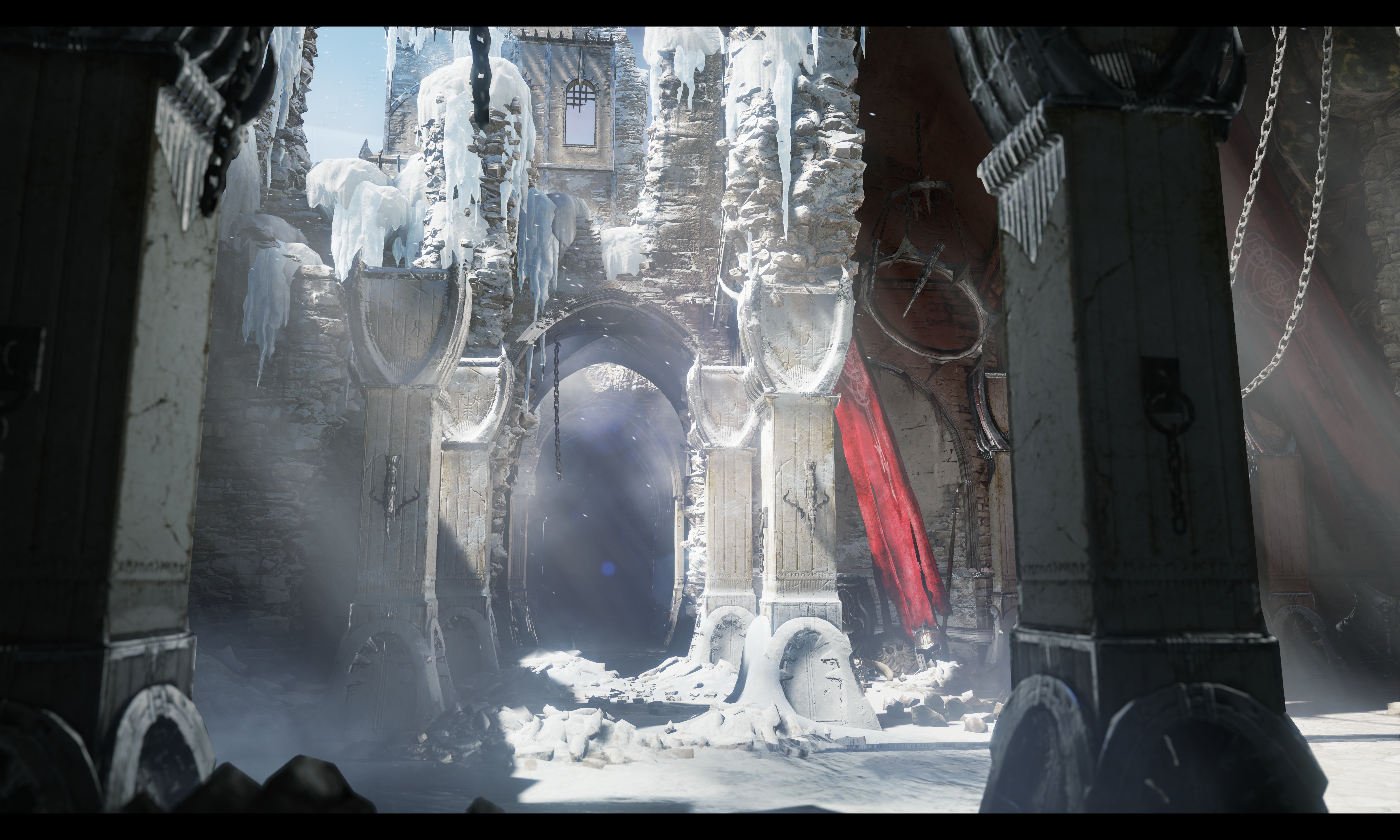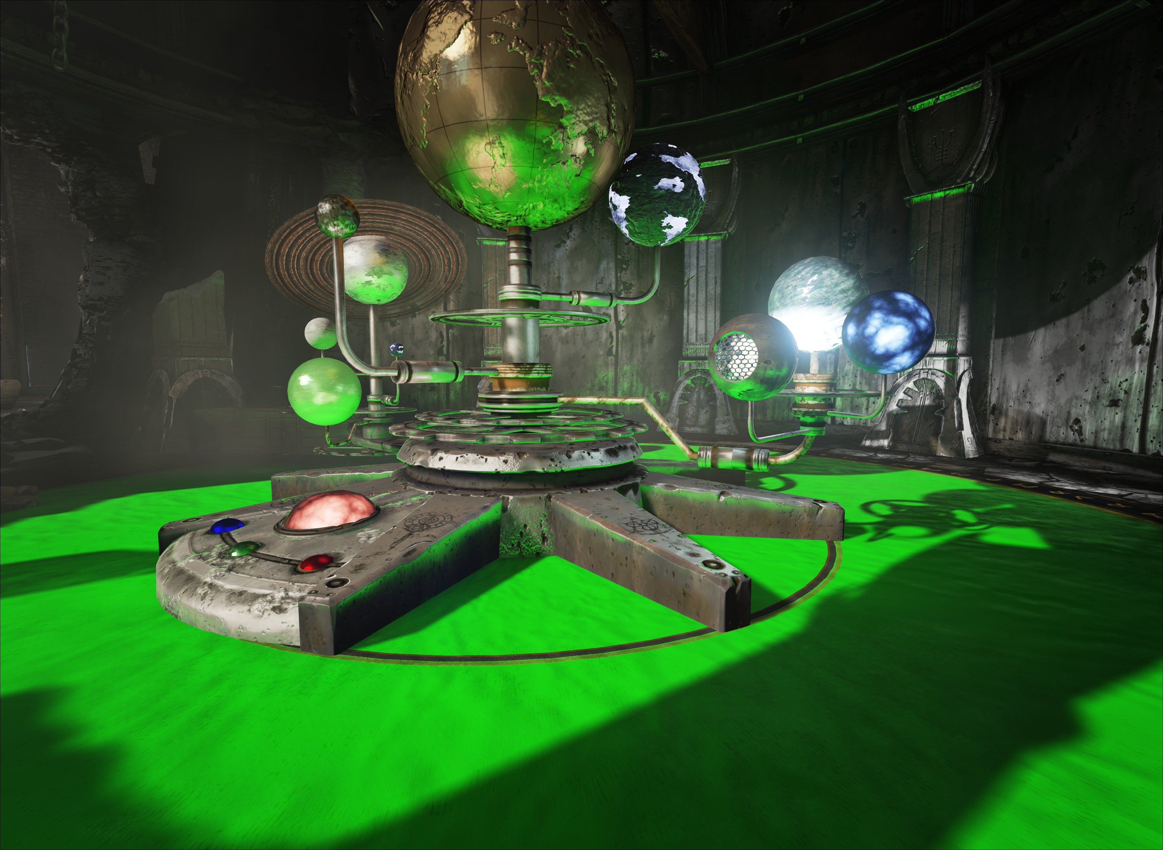 Depending on the material, all objects reflect the surroundings according to how they are lit. Light can be both direct and indirect - it literally bounces off objects, even through objects. Games designers can adjust the qualities of the materials, changing how much light passes through an object and how it is filtered. Absolutely everything is rendered in real-time - in terms of both light and shadow.