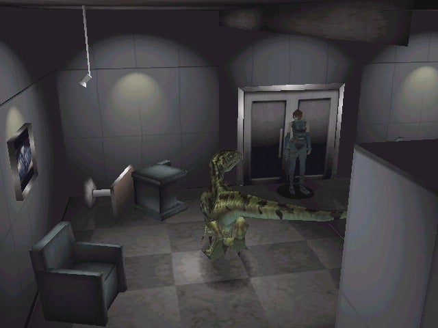 But for all Dino Crisis' stylistic departures, the underlying mechanics are still unmistakably Resident Evil. The tedious door-opening animations masking chugging loading times are a hand-me-down, as are the cinematic fixed camera angles, the awkward inventory management and the item boxes requiring 'plugs' to access. And it's a happy accident that all these things, as they did in Raccoon City, added to the air of panicked tension. These days it's taken as read that this was the deliberate intention of the game's design, rather than the technical limitations they were actually the product of. That's not to diminish their effectiveness; the fixed camera angles in particular work a treat when there's a dinosaur in the room with you that you can hear but not see. That said, it speaks to the game's sound design that its most memorable audio cue isn't the guttural lowing of a raptor, but the piercing, electronic "doot doot" of the SORT team's pagers.
