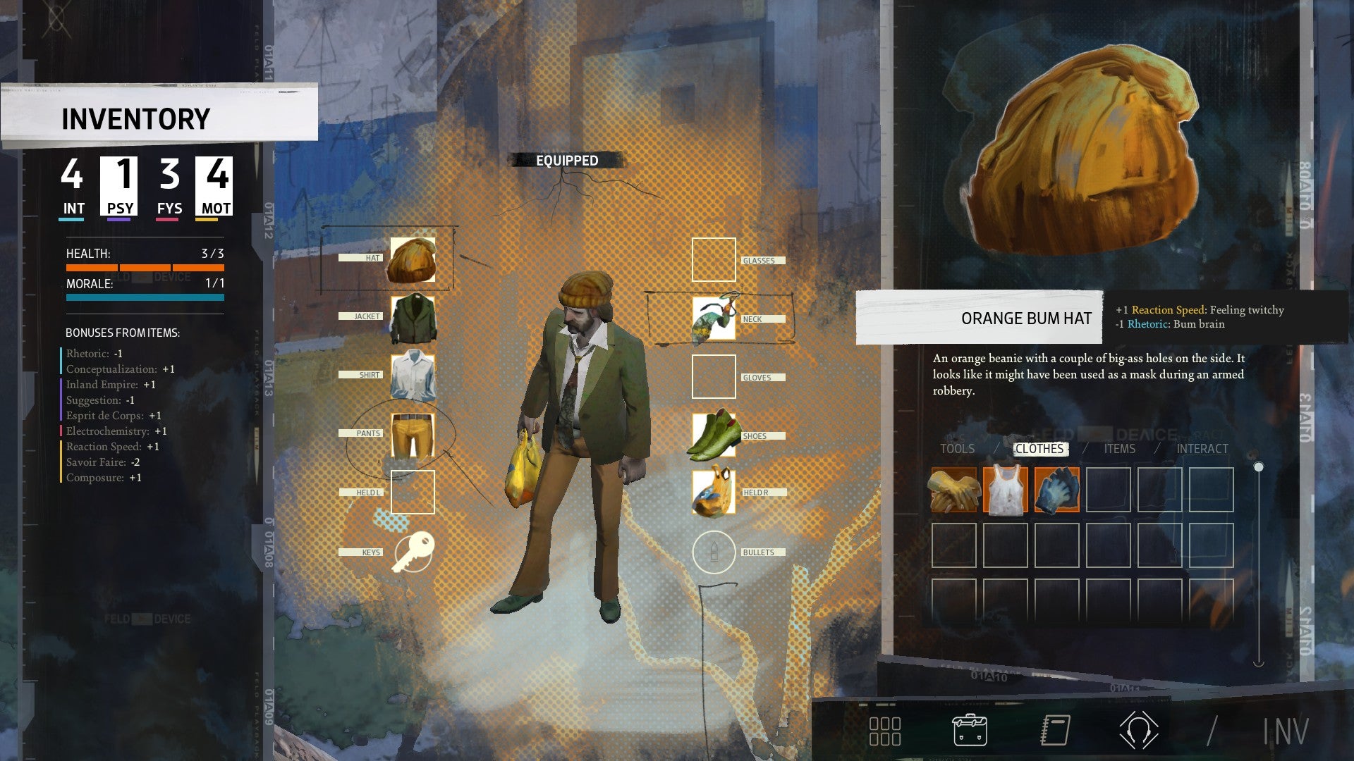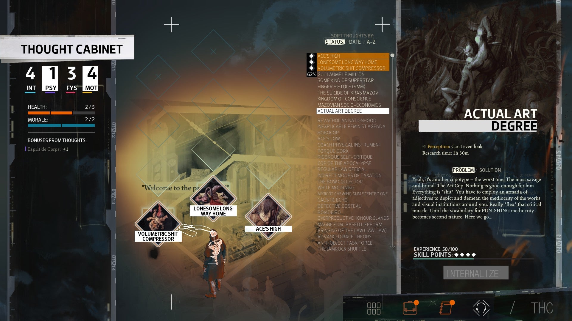 In Disco Elysium, your clothes and even your thoughts take influence on your stats. If you commit to a certain train of thought which crops up either randomly or during a conversation, you can then mull it over further in your 'thought cabinet' - basically the back of your head. After some time has passed, you have internalised the thought, which will lead you to do better or worse in certain areas. A deep-dive into the history of a famous actor, for example, causes me to lose perception, likely because I'm preoccupied with useless stuff when I should be busy with police work.