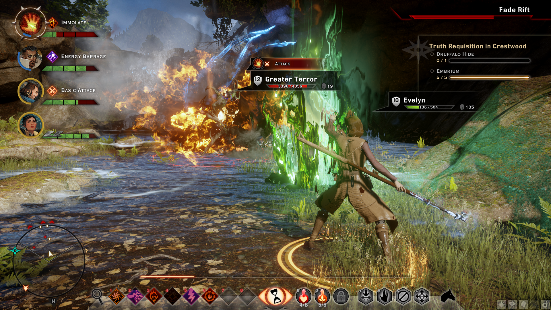 Combat tries to offer a similar compromise, though it's not entirely successful. By default fights are much like Dragon Age 2's pausable action, with other party members controlled by basic scripts. By default, for instance, they'll glug potions until you're down to two, so that you can choose who gets the last couple yourself. It's also possible to zoom out to a tactical view as in Origins and play from afar. In practice though, everyone moves around far too much and too quickly, with mages especially just spamming endless pyrotechnic attacks limited only by a slight cooldown. There were many exciting battles on the main story, but none I could say were tactically very interesting, and none of them against one of the oddly unimaginative damage-sponge bosses, with Rift clean-up detail especially wearing out its welcome. Like the equally boring Oblivion gates, every one is basically the same - deal with a couple of demon waves, don't stand on exploding ground, close rift. Yawn. At least there are meatier bonus challenges elsewhere, not least taking on the huge dragons around the world.