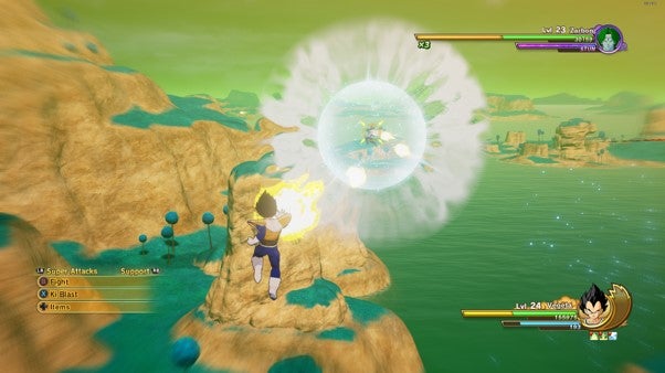 In essence, Dragon Ball Z: Kakarot is an okay role-playing game with a fantastically fun combat system attached. It's in the battles that it shines brightest, with projectiles flying all over the place and fighters yelling while they charge up for their next special move. At first it seems quite simplistic, with dedicated melee and ranged buttons begging to be mashed vigorously. When combined with a selection of super moves specific to each character and defensive options like a burst that repels enemies, the encounters never become too stale or repetitive.