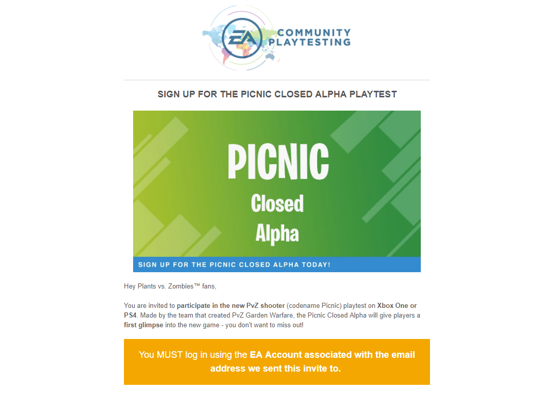 "You are invited to participate in the new PvZ shooter (codename Picnic) playtest on Xbox One or PS4," the invite's text reads. "Made by the team that created PvZ Garden Warfare, the Picnic Closed Alpha will give players a first glimpse into the new game - you don't want to miss out!
