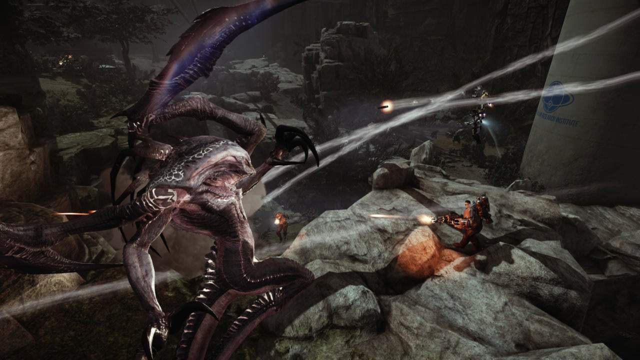 As limited as it appears to an outsider, a game like Destiny keeps players locked into its loops through more than numerical withcraft - the physical chain that starts in the trigger finger and ends in the fizzing pop of a exploded alien head remains compelling thanks to an inscrutable army of small design choices that Bungie has spent over a decade refining. Evolve doesn't have this - it rarely surprises, and when the excitement of seeing, outwitting and eventually defeating its monsters subsides, it feels like it lacks the gimmicks to keep you in suspense. It may even be as facile as the fact the monster doesn't really react under fire.