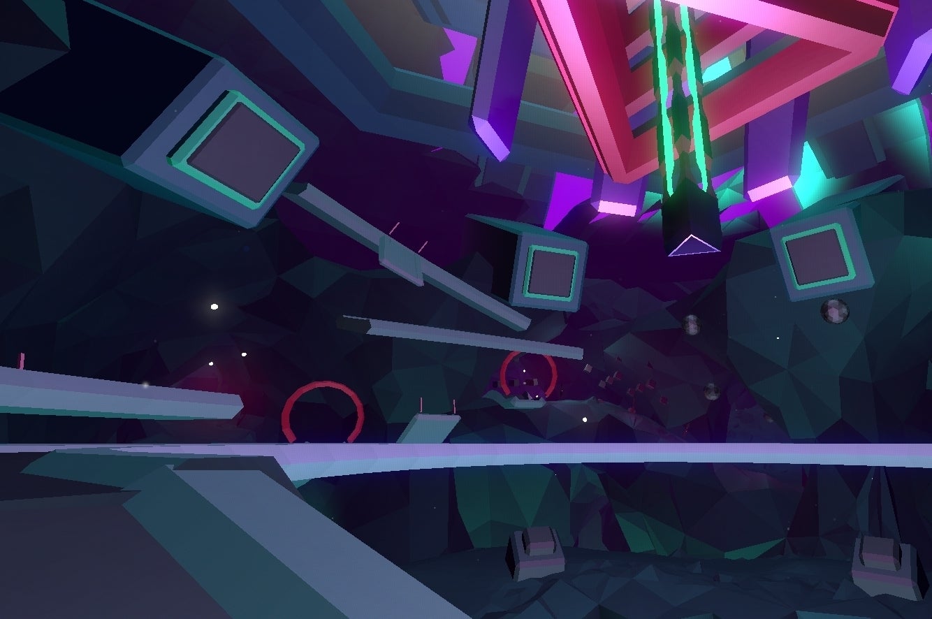 "I always wanted it to be pretty big in terms of the scale and size of the space." Richard E Flanagan has been making Fract OSC since Fract, the original prototype, won the Student IGF prize in 2011. What was then a sprawling, unfocused expanse of fractured geometry and primary colours has become something altogether more beautiful and evocative. There's more than a little Tron in Fract's visual heritage, filled as it is with giant beams of light lancing the stratosphere, huge monoliths ringed with neon fluorescence and a consistent line of geometry in every piece of architecture.
