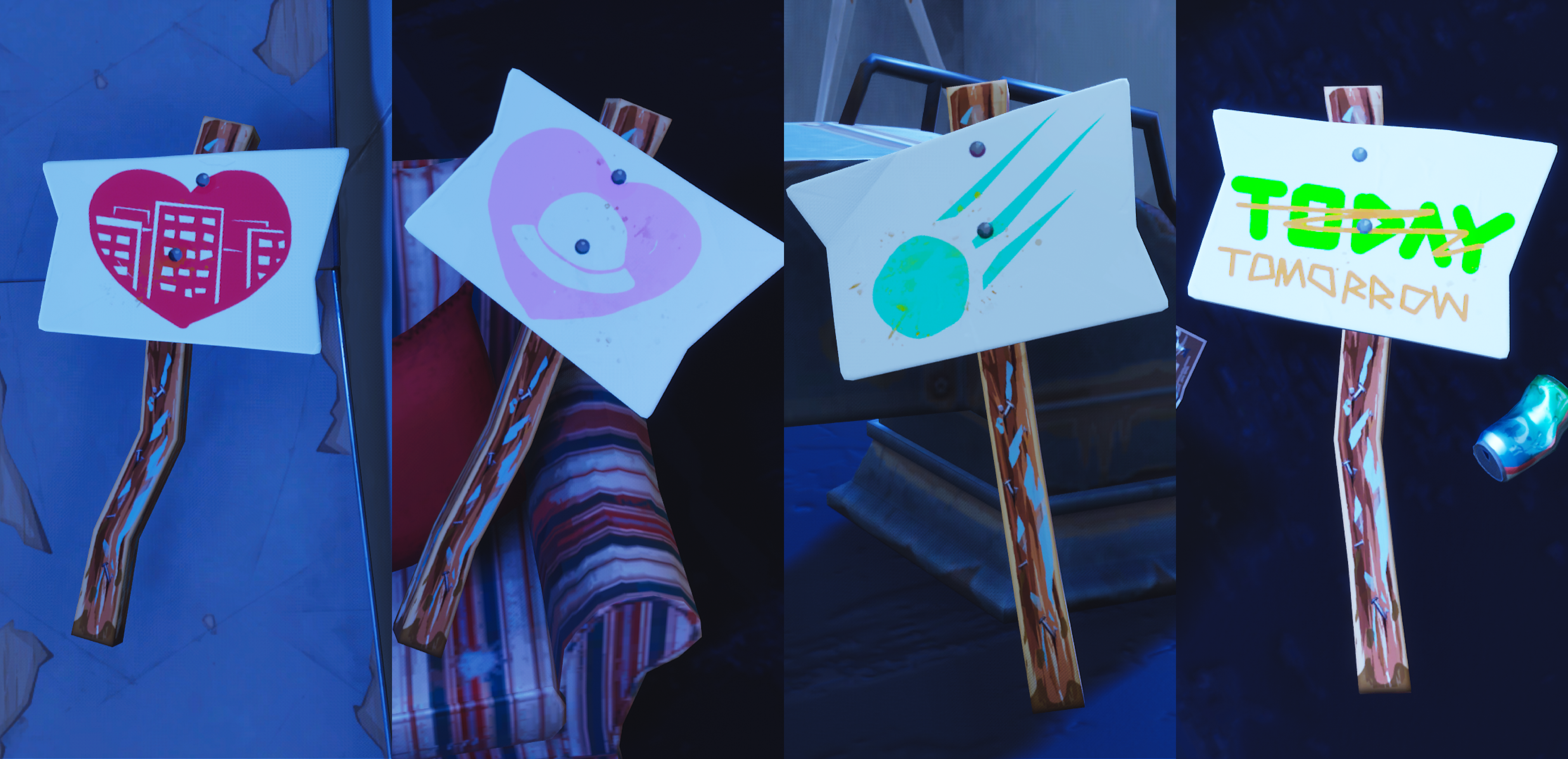 These have been interpreted as bit of a cheeky wink aimed at Fortnite's meteor-obsessed conspiracy theorists, with one sign proudly exclaiming "TODAY", hastily scrawled out and replaced with "TOMORROW" - likely a reference to the community's constantly shifting attempts to pin a date on a possible Tilted Towers destruction day.