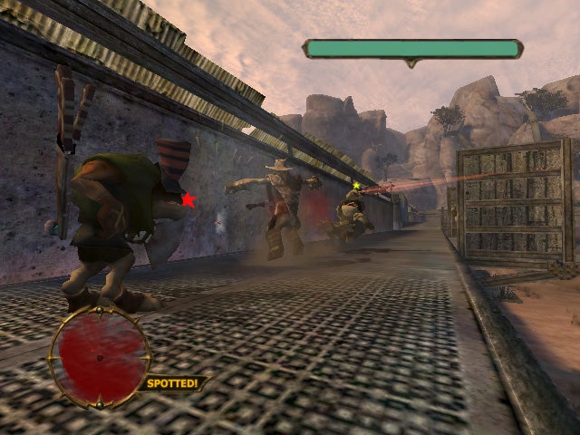 "I don't like guns," drawls the gravely-voiced Stranger as he snaps his enemy's favourite rifle in two. We're never sure exactly why, but it's a fact we have to take on board right from the start of Stranger's Wrath, Oddworld Inhabitant's three-year-in-the-making fusion of first-person combat and third-person action adventure. Maybe he's just pissed off with being shot all the time. Maybe his malformed hands just can't quite get on with the trigger mechanism. Maybe Oddworld was just really bored with the idea of making another game with traditional guns in it.
