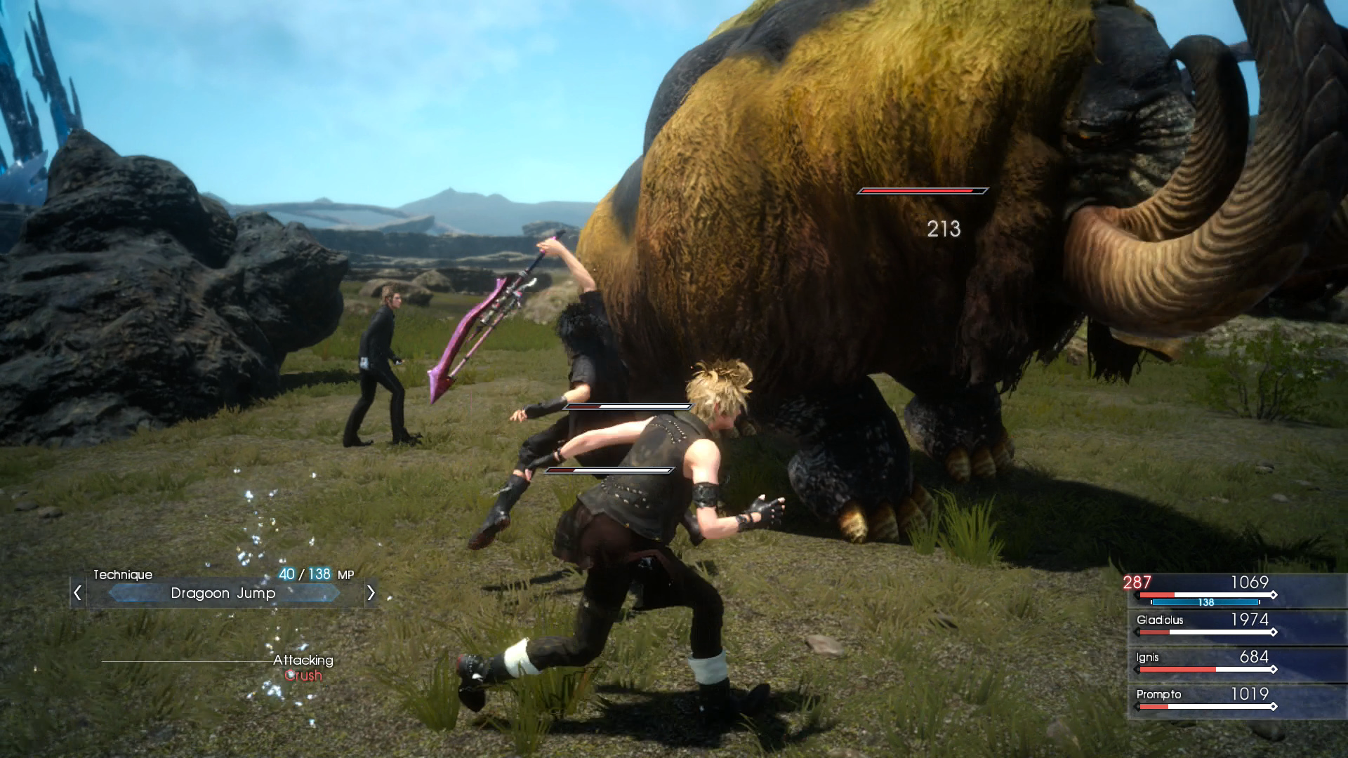 Combat, once initiated, occurs in real-time, with you controlling Noct and the rest of the party taking care of themselves. On PS4, the square button performs physical attacks whilst triangle triggers whichever special attack Noct currently has equipped. Special attacks are mapped to the arsenal of weapons he carries; his Blood Sword enables a Drain Blade technique, for example, which converts damage dealt to HP, and a Wyvern Lance allows for Dragoon Jump, an ability that sees Noct jump off screen and come smashing down on the heads of his enemy, recovering a small amount of MP in the process.
