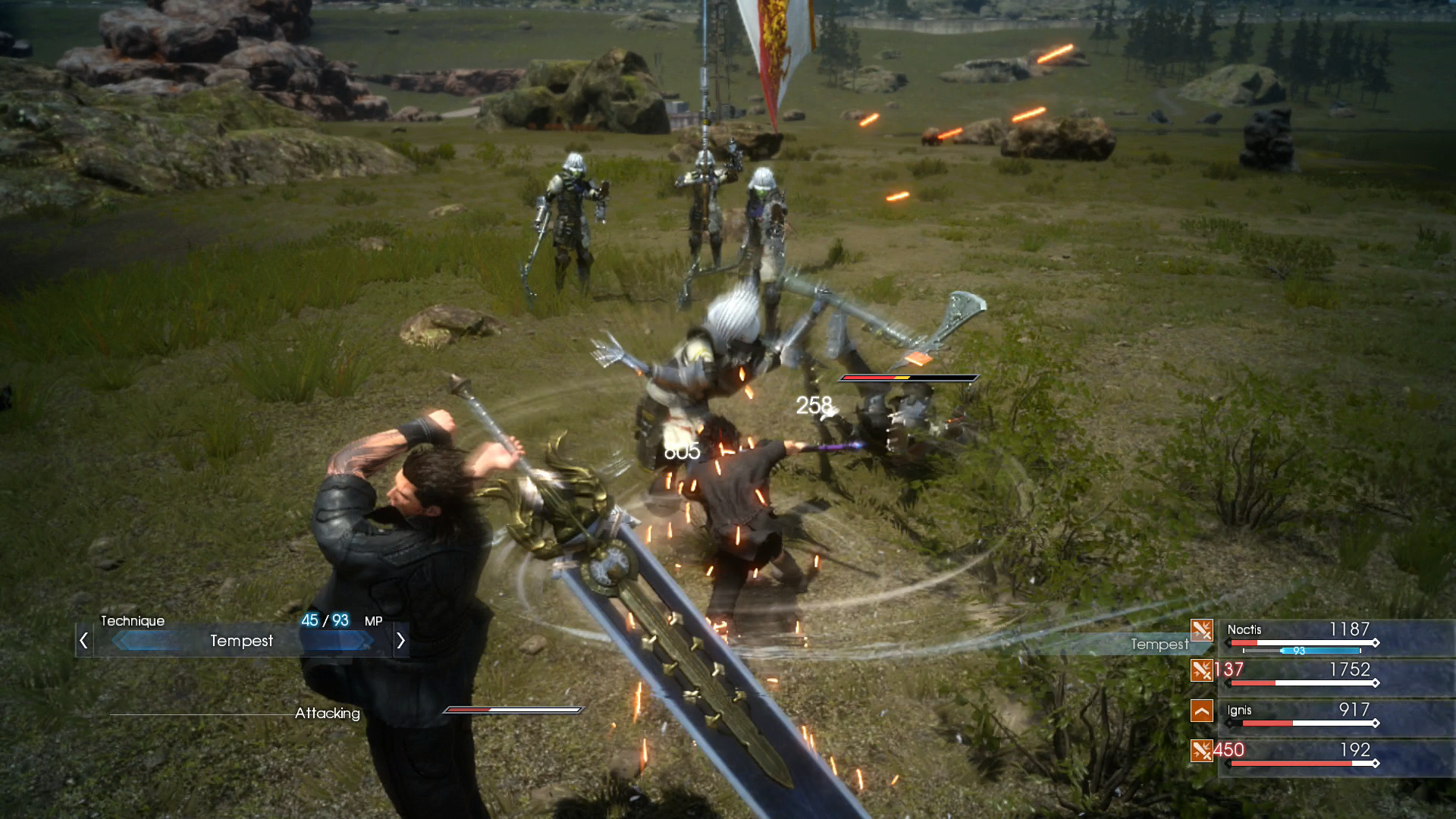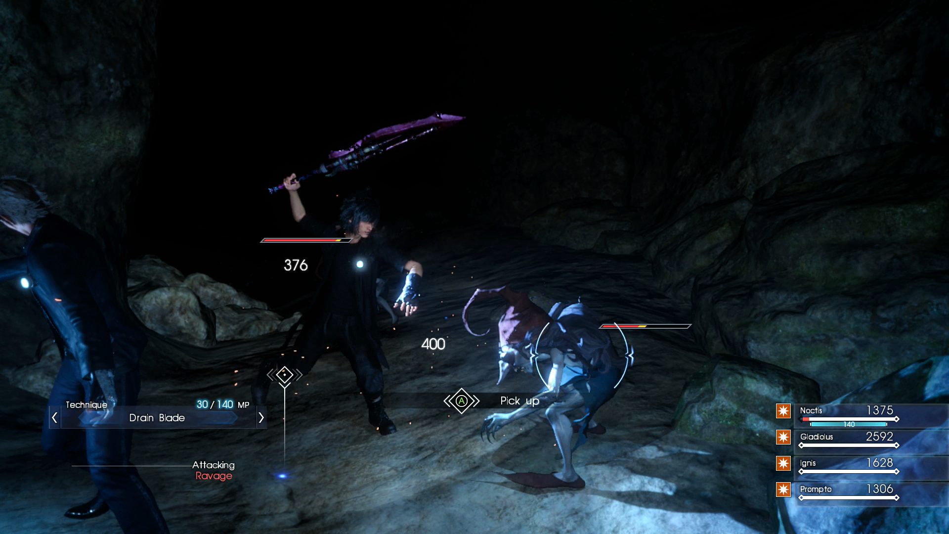 Holding L1 puts Noct in a defensive state where he will dodge enemies that lunge for him, but this drains MP. Whilst in a defensive state you'll sometimes be given the fleeting opportunity to parry or team up with another party member to counterattack an enemy, which looks pretty flashy when successfully timed. Needless to say, this approach to combat is a far cry from early Final Fantasies, being more akin to the systems found in 12 and 13. It more closely resembles a modern hack-and-slash than an old-school turn-based Final Fantasy, and it can be difficult to settle into its flow at first - but after a few battles it begins to feel natural, and the counterattacks, which vary depending on the enemy, are supremely satisfying to pull off.