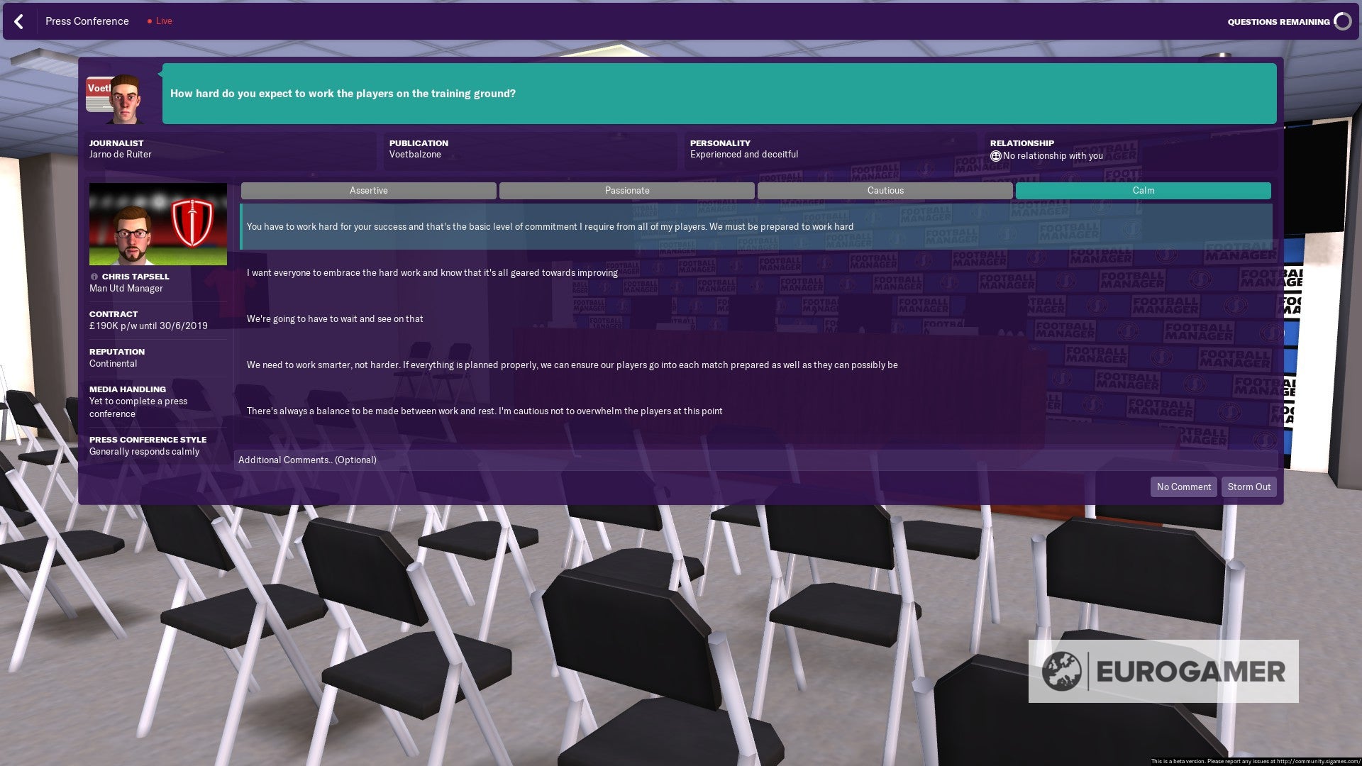 Other impacts and systems are now obfuscated or just plain hidden altogether, when previously they were well known. Players now have a Training Rating score, for instance, which is great, and very welcome, but there are issues: previously your way of knowing how a player worked in training was to see a drop in their stats after the fact. Chastise their work rate and they'd promise to do better, maybe see an increase in their Determination, and work harder next time.