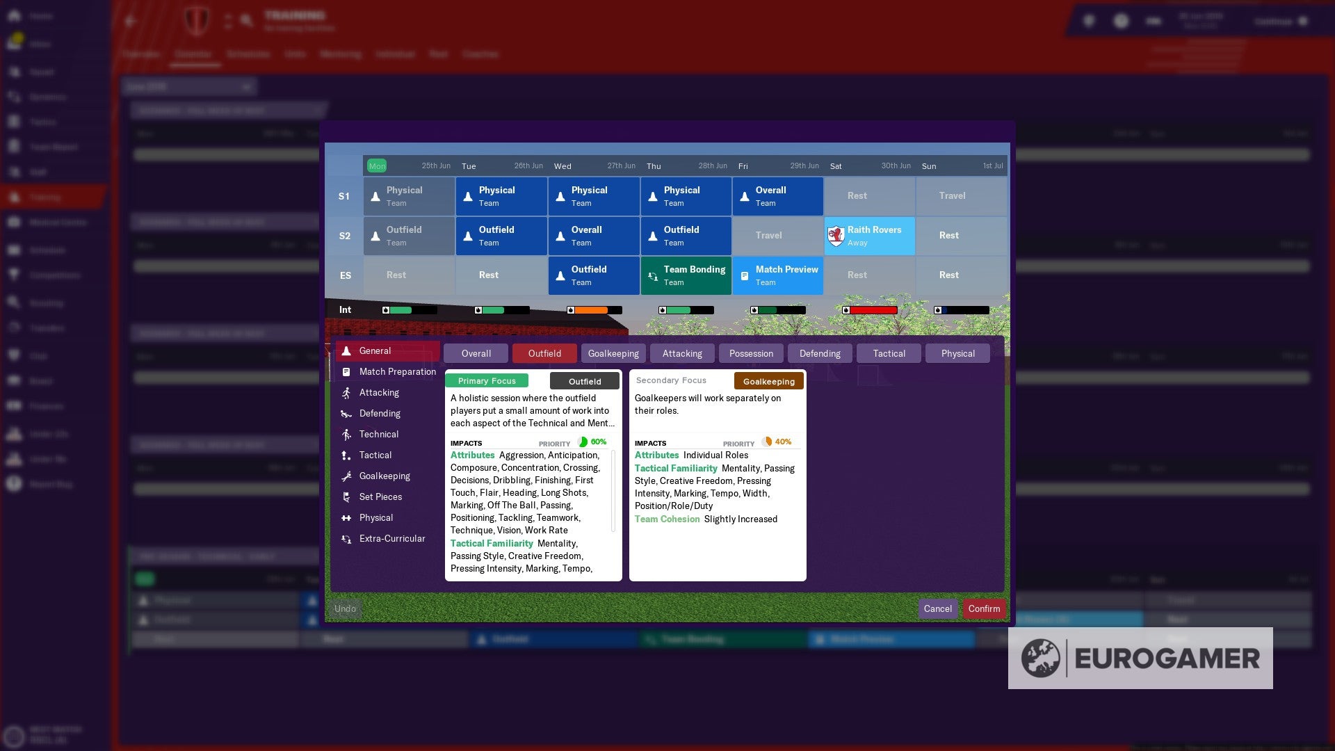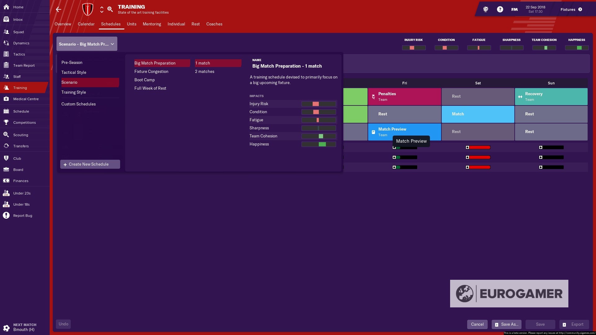 In Football Manager 2019 that big, frustrating addition is a totally reworked way of handling training. I appreciate that sounds like it's not that big a deal but the training ground, when you think about it, is where a lot of any professional football club's time and effort is actually spent. Pundits call the midfield the engine room and that might be true, at least on the pitch, but the engine room of a club, the thing you're looking after, gaffer, is where you train. Put it like that and it makes sense Sports Interactive would look to expand on it in FM19. Training has often felt pretty neglected in Football Manager, given the sheer number of days you'd spend out there barking feedback and planning sessions if you were the real deal, with previous games in the series boiling it down to the essence of hiring your staff well and distributing their time efficiently. Get a five star coach in each discipline and hire enough of them to keep the workload light, and job done.