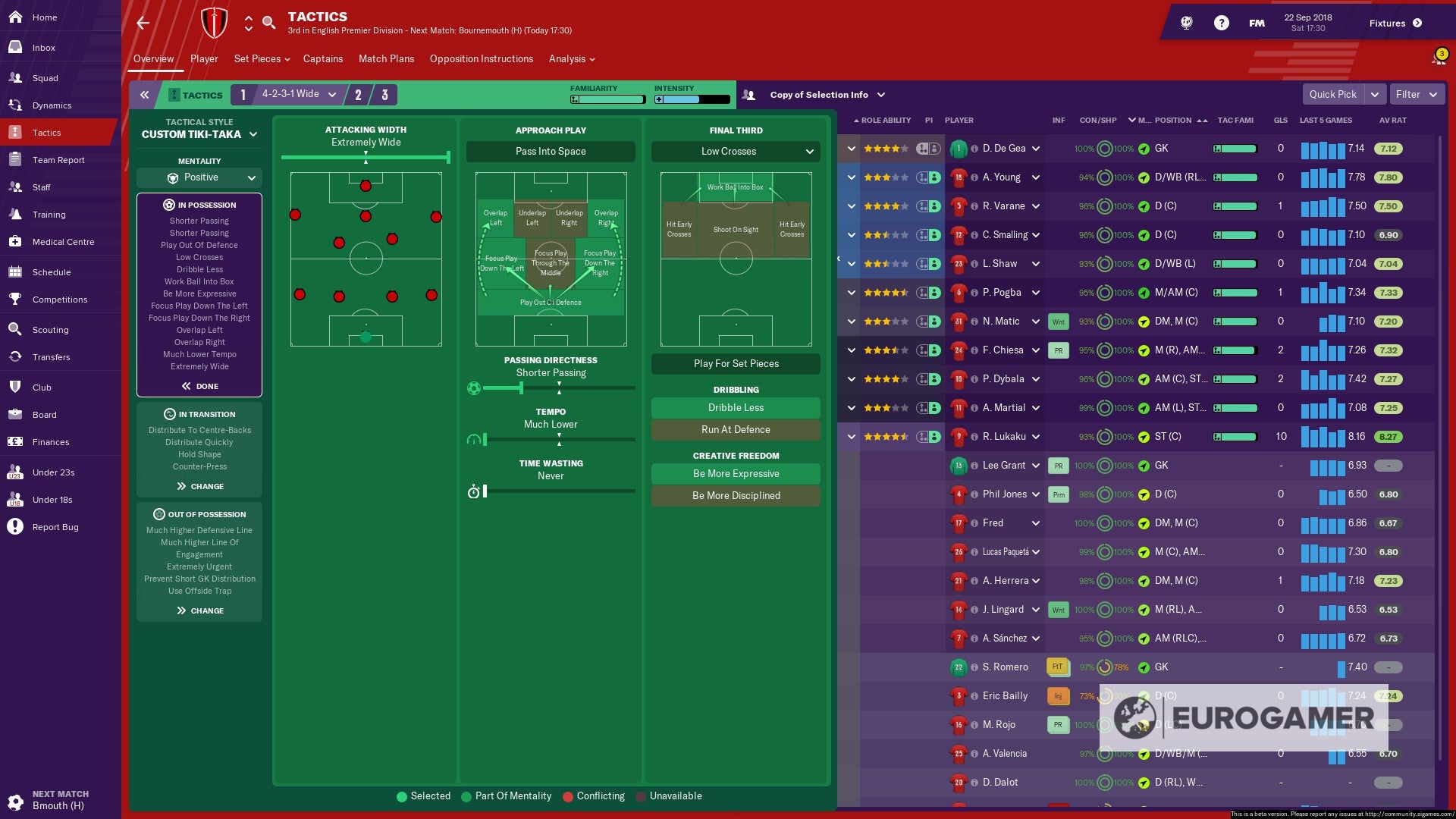 In FM19 that was no longer the case: at Manchester United I had David De Gea get a high Training Rating, a good write up from the coaching staff, be in great form and condition and high spirits, and see a drop in attributes across the board. I tried the old method of criticising his effort only for him to politely and, quite rightfully, protest that he'd been training perfectly well thank-you-very-much. So what gives? Presented with moments like this, you're left with two unpalatable options: it's not supposed to happen, and you've found a bug; or it's supposed to happen, but there's no way to know why, or how to prevent it, or how to respond. It's disempowering, in a game about being in charge; asking you to solve a puzzle - or better yet, play a game - without first knowing the rules.