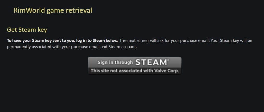 Sylvester had enabled a system to coincide with the Early Access launch where everyone who already owned RimWorld would be able to move their game to Steam. To do this, he gave out Steam keys via an automated link and key sender. All you had to do to get your RimWorld Steam key was log in to Steam via the RimWorld website, which would then ask for your purchase email. Your Steam key would then be permanently associated with your purchase email and Steam account.