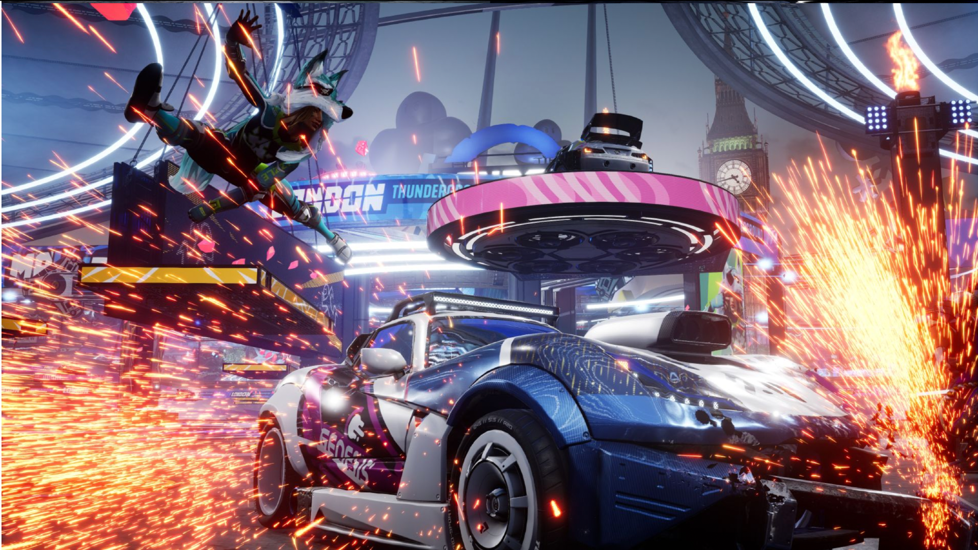Colin Berry: One of our pillars in the game early was momentum. It's that idea of when you're in the car and you get hit and your car explodes and you're ejected from the car, you're not always KO'd. So you come out the car, you land, in the moment you land, you can hit a button and get a landing boost, and you can roll and then you're on foot, you're running, you're dodging, and you can vault over walls, you can vault boost. And for the character stuff, it was like, we just want it to be fluid. And like I say, our animation director used to work on Assassin's Creed so that really helped with this feeling of keeping fluidity and momentum.