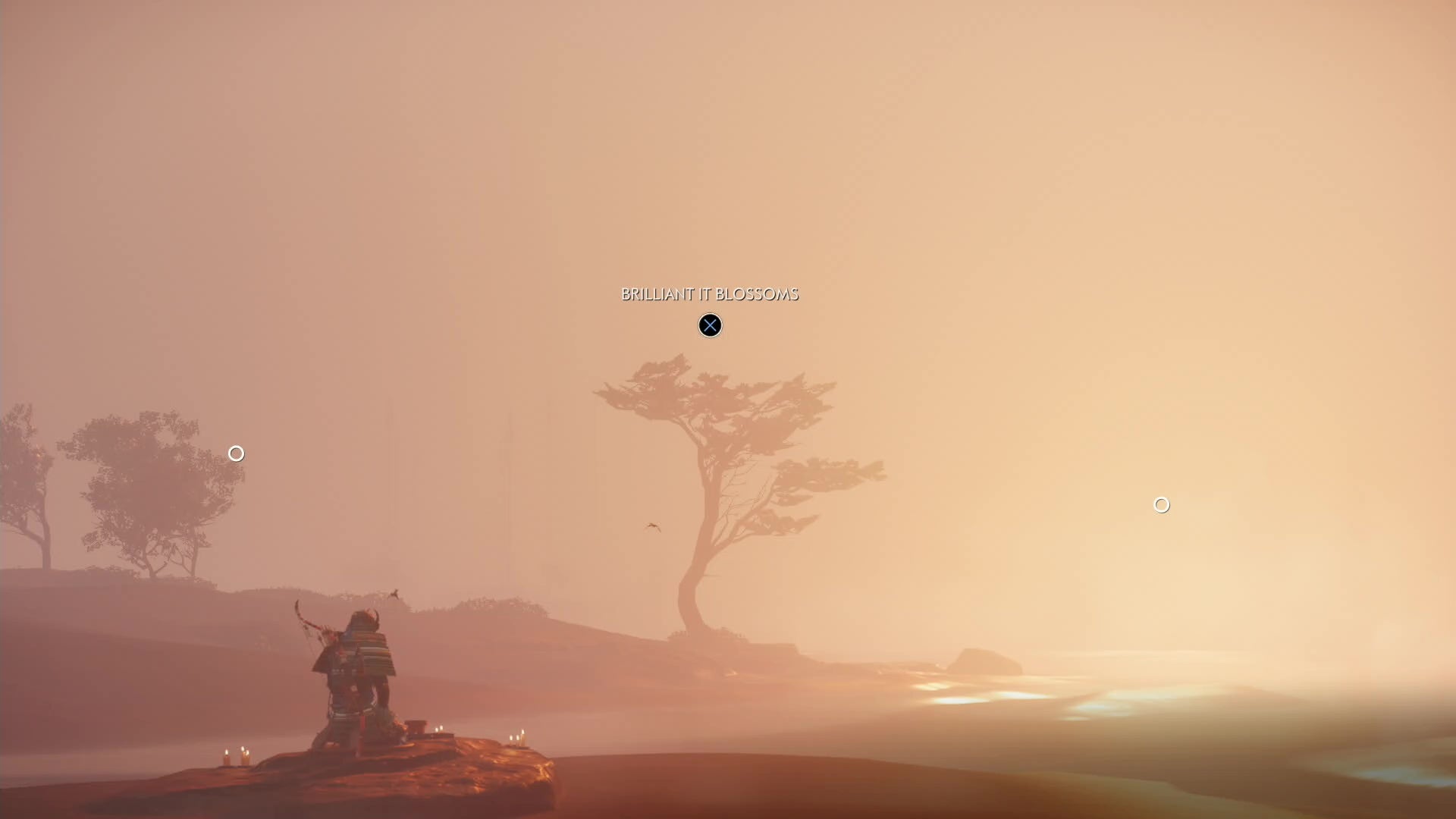 Spanning the island are a litany of fixed, more or less identical locations-of-interest, which all involve a set interaction and a set reward (and all of which you'll be led to by the game's clunky, if admirable attempt at using nature for navigation - gallop past a nearby point of interest and a golden bird will appear, piping up incessantly in invitation to follow it to whatever that undiscovered spot may be). Those points of interest never change, though - they never deviate from the set list of things to do that you can check off from lists in the menus. So there are hot springs which you press R2 at to bathe in and increase your max health; fox dens, where you follow a mewling, over-adorable fox to a shrine, which you press R2 at to increase your max charm slots; bamboo strikes, which do at least give you a very brief, quick-reaction button-pressing minigame to beat before their designated reward (there's an accessibility option for turning off the time-sensitive element, if that sounded worrying to you).