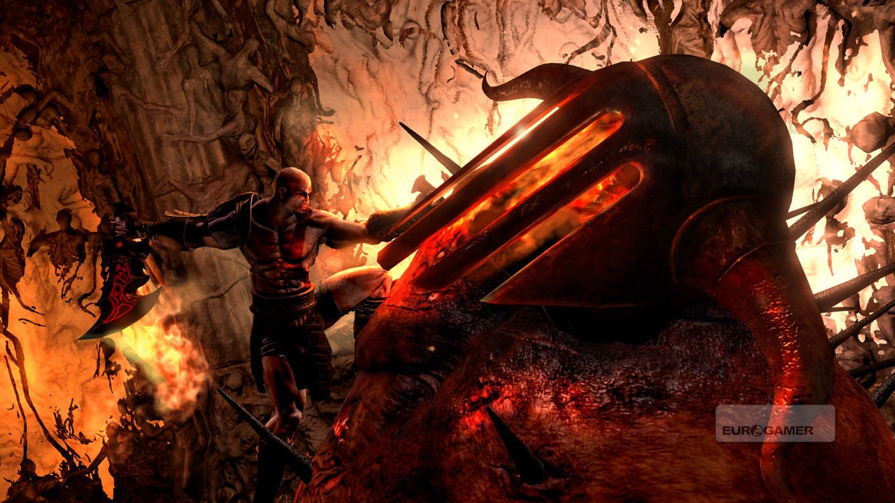 So angry at the world that he's literally purple, God of War's vengeful Spartan is almost comically deadly. His has always been a world drawn entirely in black and white. OK, and red. It's a place with no need for an in-game morality system; early on in part III, crawling along a flaming ledge, Kratos spots a peasant, surrounded by flames and steep drops, waving for help with a button prompt floating overhead. The option to be nice? This is new. Not really - that prompt isn't to lift him to safely, but to mash his face against the wall. Good work.