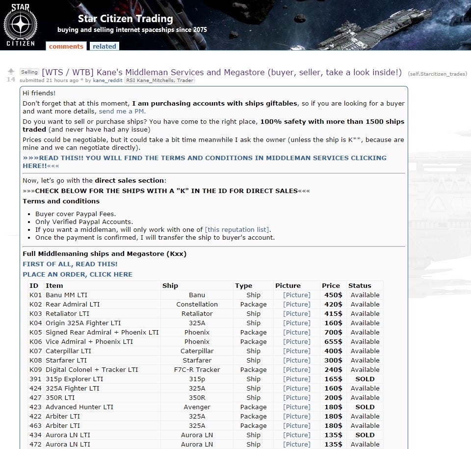 "My main objective as a middleman is to offer safe transactions, both to buyers and sellers," Kane says. And for this service middlemen charge a fee. Kane says when CIG imposed limitations on Star Citizen's gifting system, it removed an important defence against scams. Buyers and sellers must contact each other directly in what are, essentially, blind transactions. "Please, don't misunderstand me, I understand perfectly, and support CIG and this measure because they have reduced the possibility of scams long-term," Kane says, "but short-term it will be easy for the scammers to get the money and run."