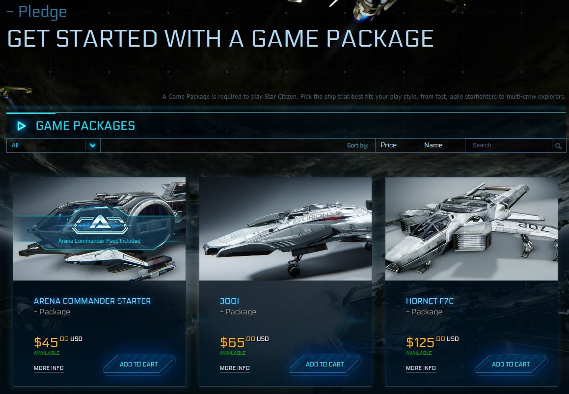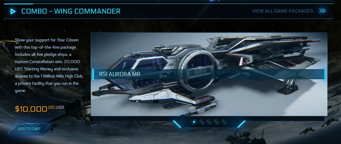 Star Citizen's "in-universe" store sells many ships for use in the game. They range in price. The $45 Arena Commander Starter package includes immediate access to the dogfighting module as well as the Aurora MR ship. But there are scores of more elaborate ships and packages available, and some are pretty expensive.