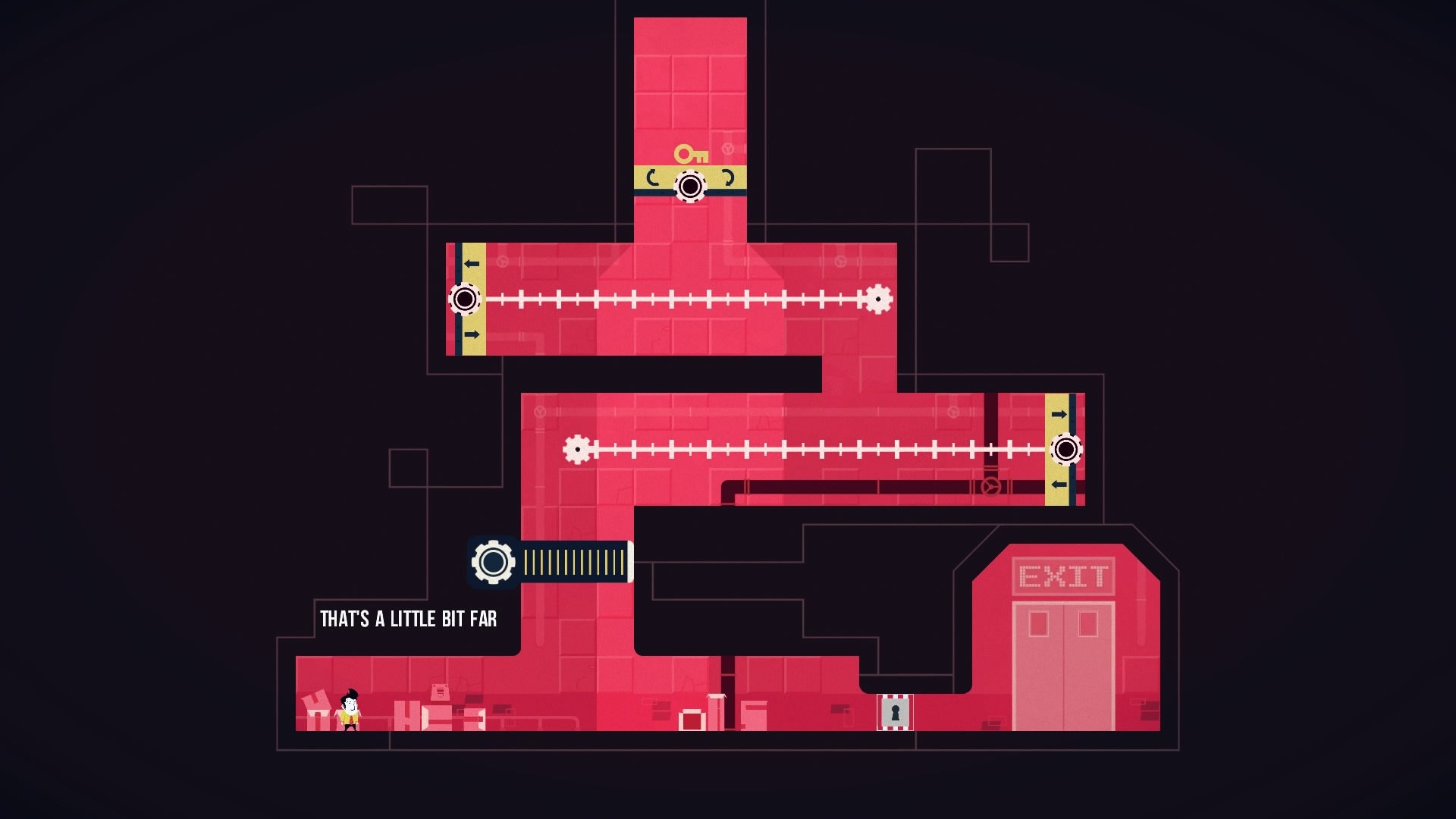 Twists? Plenty. Early on, I discovered a secret area, for example, in which I could only move left, and that transformed the landscape of interactive platforms and railways into something very like a machine. Later on, I found the first of many levels which actually was a machine - a single-screen affair where I had to coax a key down from a very high ledge, not by platforming so much as manipulating platforms I couldn't otherwise reach.
