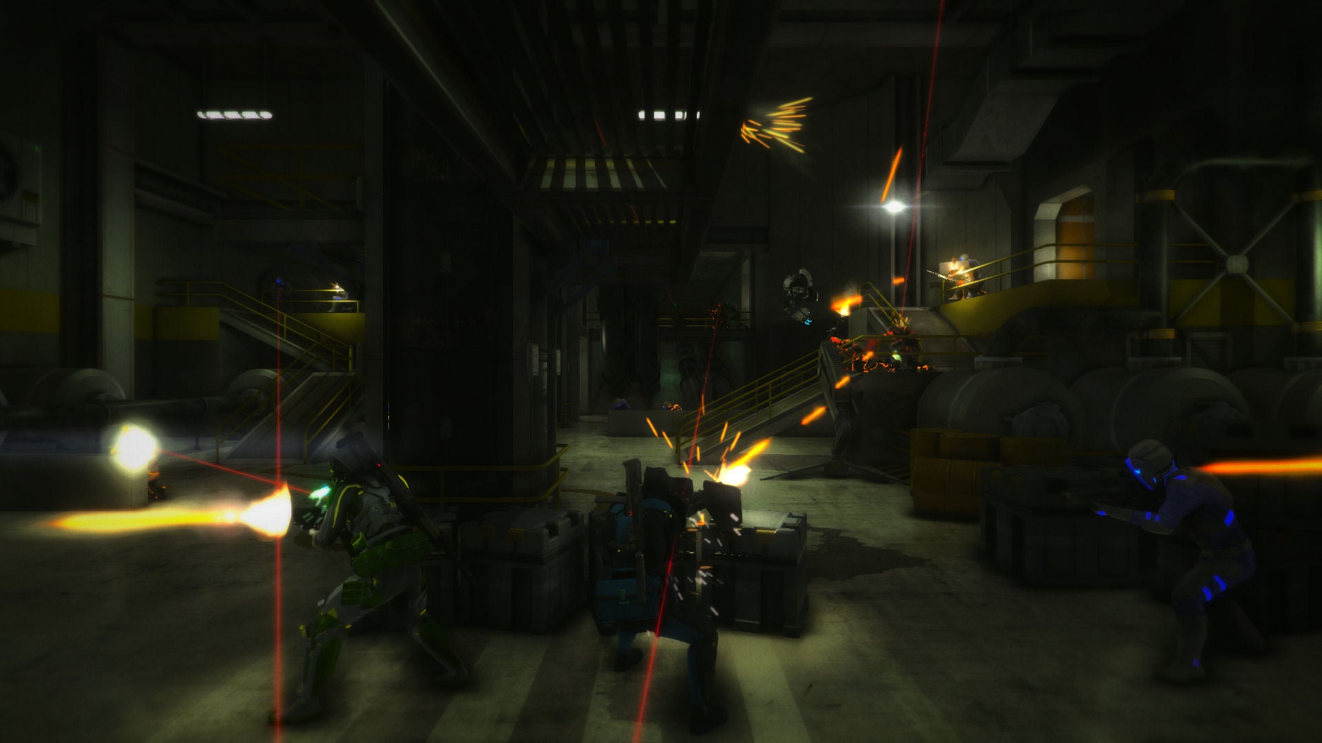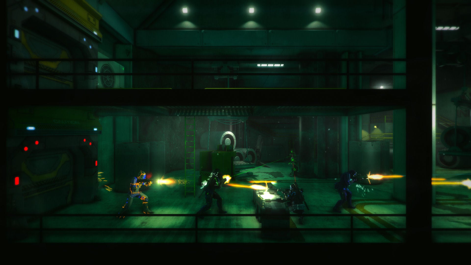 It's a slightly clumsy term, but Ruffian's creative director Billy Thomson calls Hollowpoint as a "2.5D game" and I can't think of a better way to describe it myself. At first, it looks and plays like a platformer. The player has control over two of those dimensions, sending their futuristic operatives dashing left and right through industrial environments, leaping onto gantries or ducking behind the inevitable and multitudinous crates. The third dimension is reserved for their opponents and while there is some face-to-face combat when (or if) enemies close in, much of the action comes from firing not left and right, but forward, inward. Hollowpoint almost turns from a platformer to a cover shooter and its detailed, busy backgrounds are quickly populated by drones, robots and soldiers.